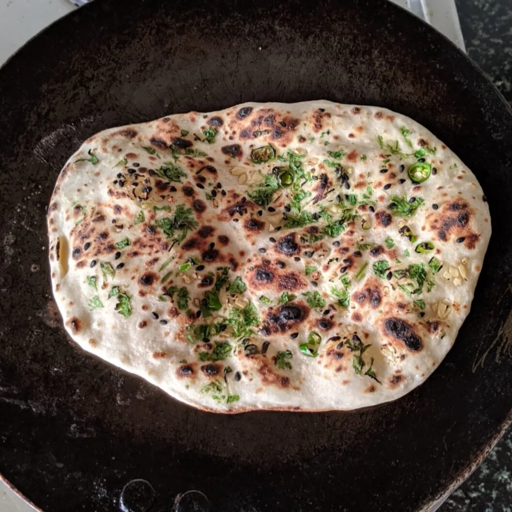 Knead the dough once again and then make equal size balls of the dough. With a rolling pin roll one ball into a round or oval shape chapati of medium thickness. Sprinkle it with some chopped garlic , green chilies , coriander leaves, black til and kalonji and then roll it lightly again with the rolling pin so it does not come out.