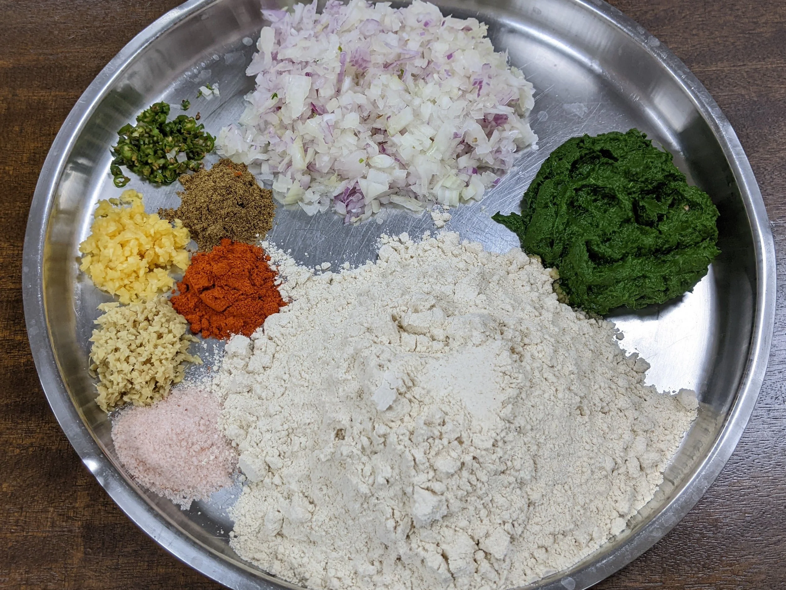 In a bowl add the atta, all dry spices, salt, green chilies, palak paste and cooked onions . Mix well , slowly add water little by little and knead into a semi soft dough.