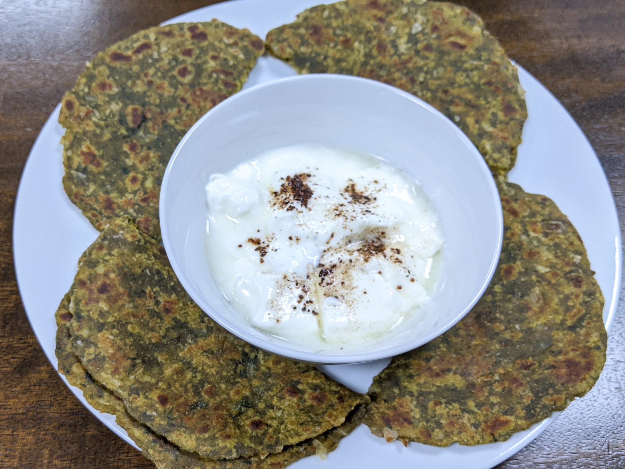 Enjoy this healthy and tasty palak parathas with yogurt.