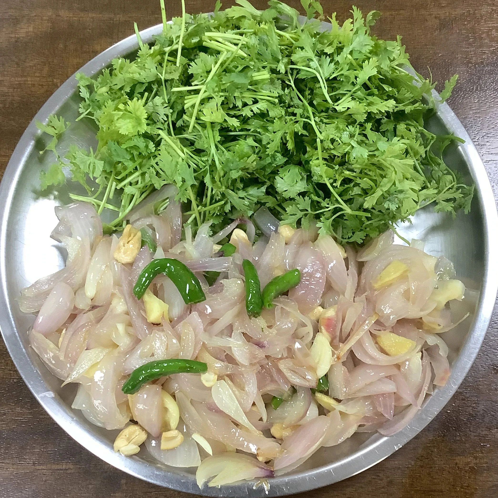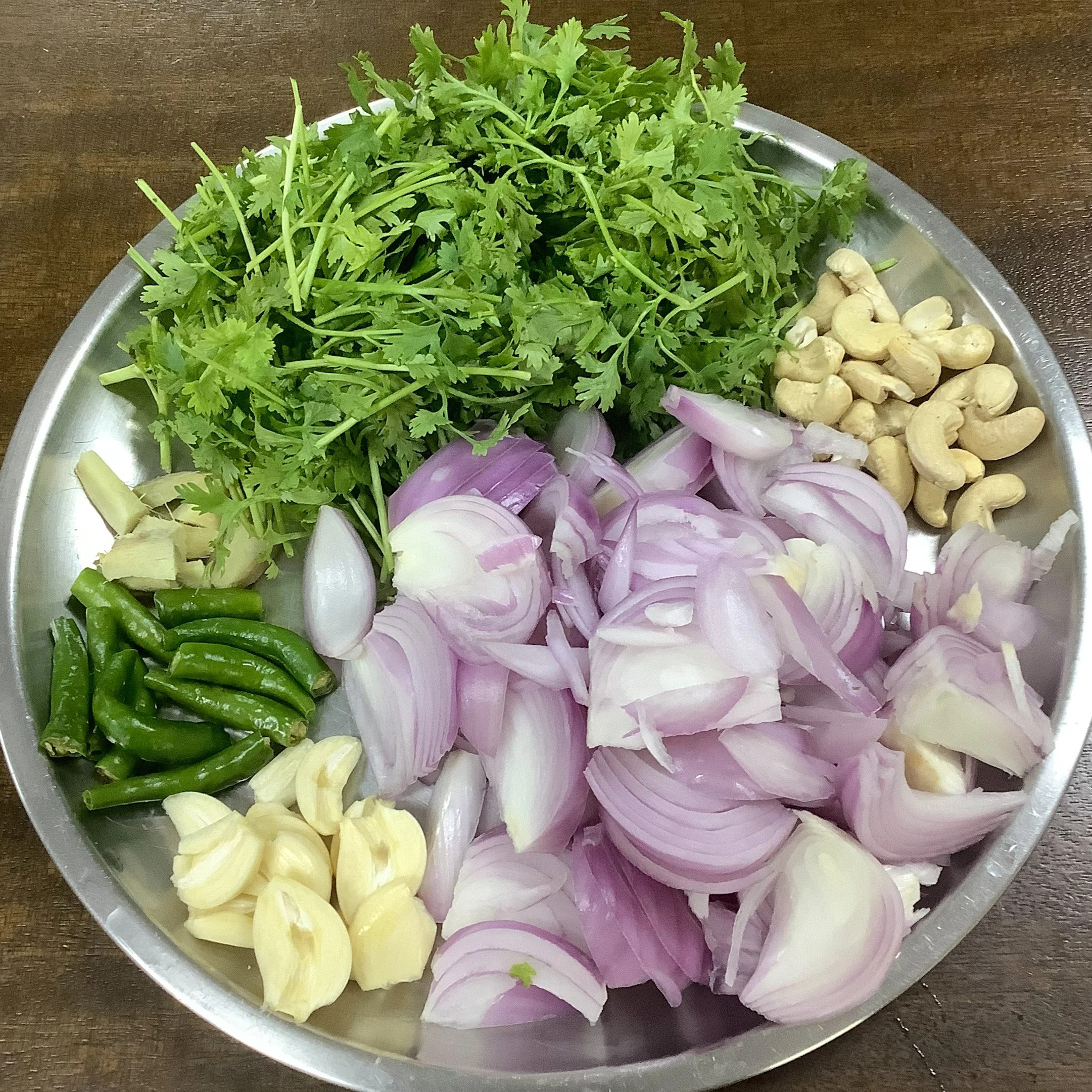 In a pan heat 1 tbsp oil and cook the sliced onions, ginger, garlic and green chillies for about 2-3 minutes or till soft. Remove in a plate and allow it to cool. Clean , wash and roughly chop the coriander leaves.