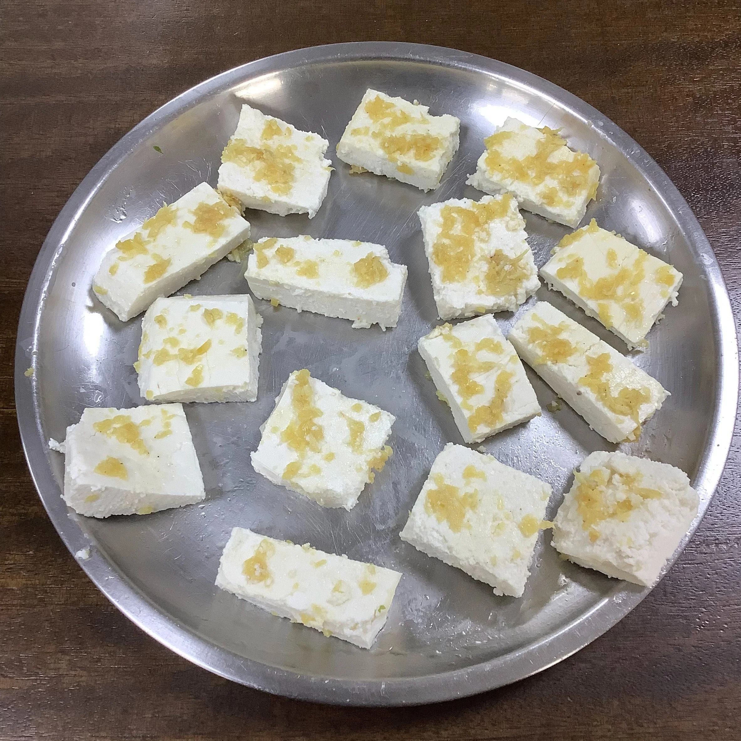 Mix the ginger garlic paste, salt and asefodita. Smear the mixture on each paneer cube and allow it to rest for 10 minutes.