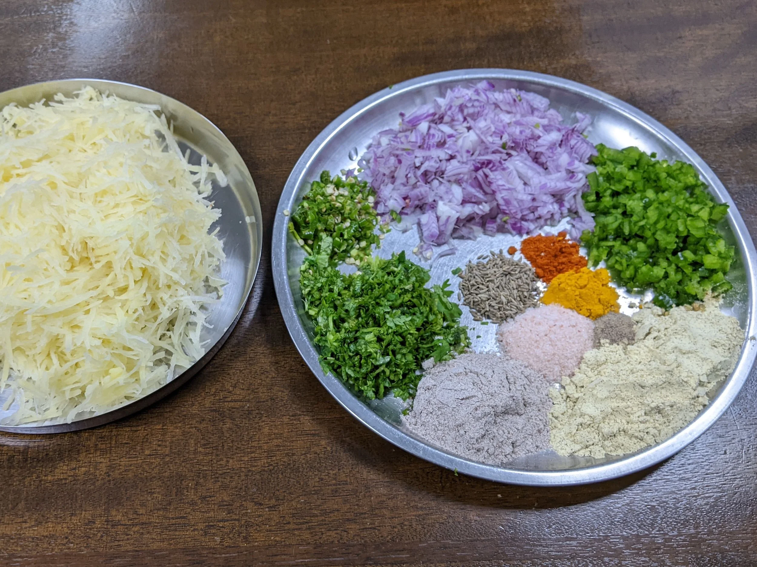 Peel, wash and grate all the potatoes. Soak in water for 5-10 minutes to remove all the starch from the aloo and then wash 2 to 3 times again in water. Squeeze the water properly from the grated aloo and keep aside.