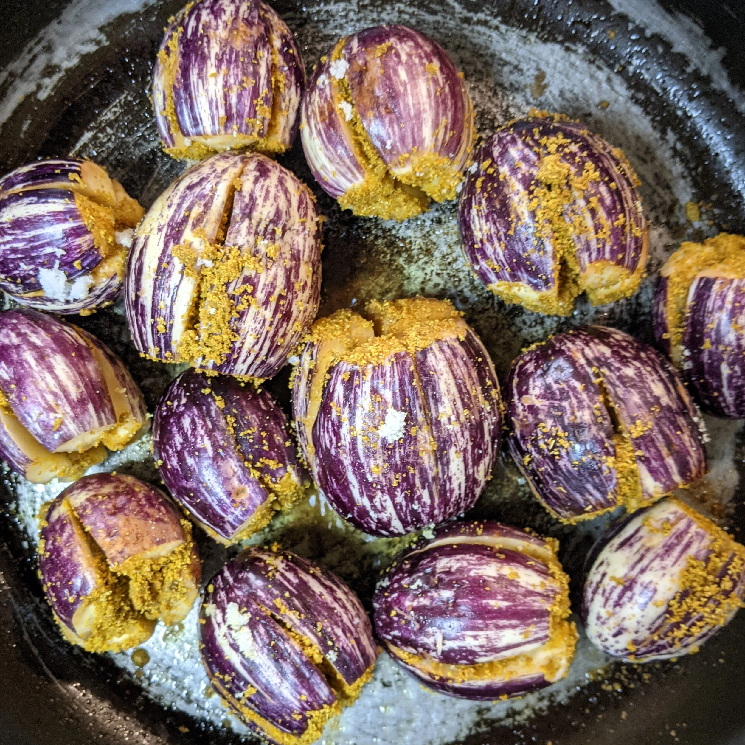 Take a pan heat 2-3 tbsp oil and place the brinjals one by one. Cover and cook on low flame on both sides till it is soft but do not overcook them.