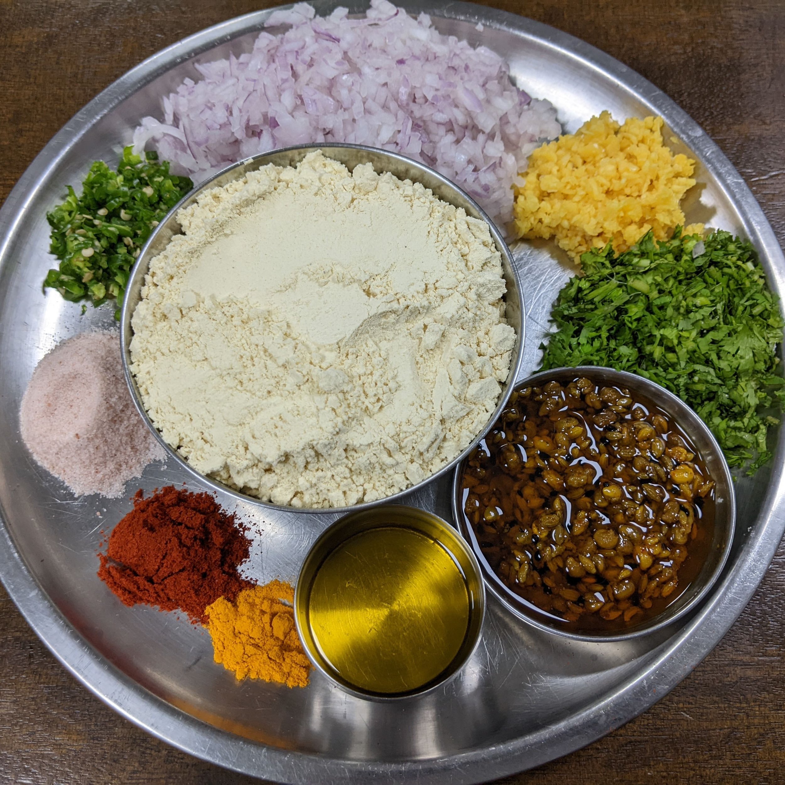 In a bowl add all the ingredients of the dough and mix well. Slowly add water to the atta and knead into a soft dough. Make a smooth ball and keep aside for future use.