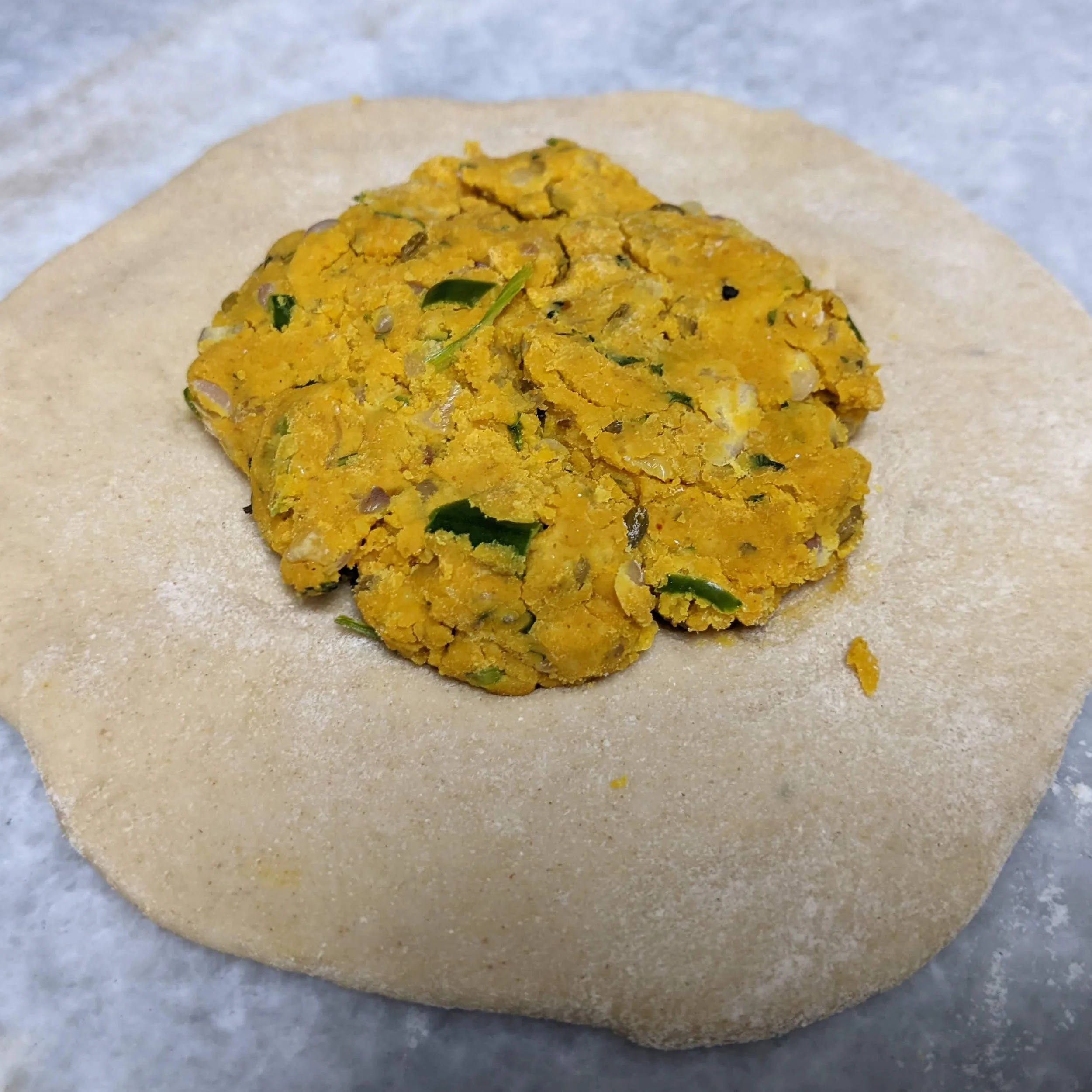 Make equal size balls of the entire dough. Take one ball , dust some flour on a rolling board and roll into a small disc then place generously some filling on it then bring and close all the edges together. Remove the extra dough and gently flatten it.