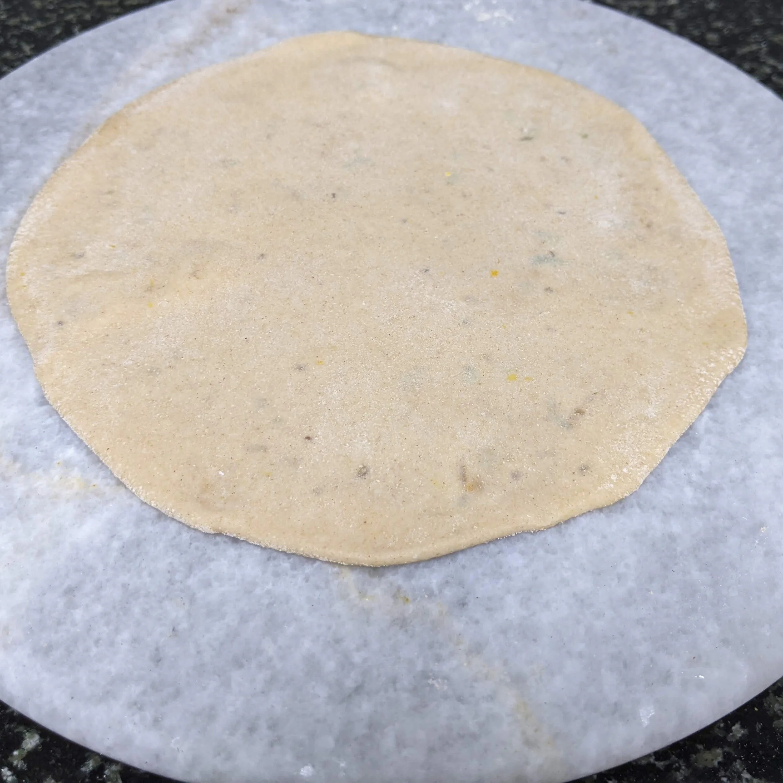 Dust the flatten ball with some atta and roll into medium thickens round paratha.