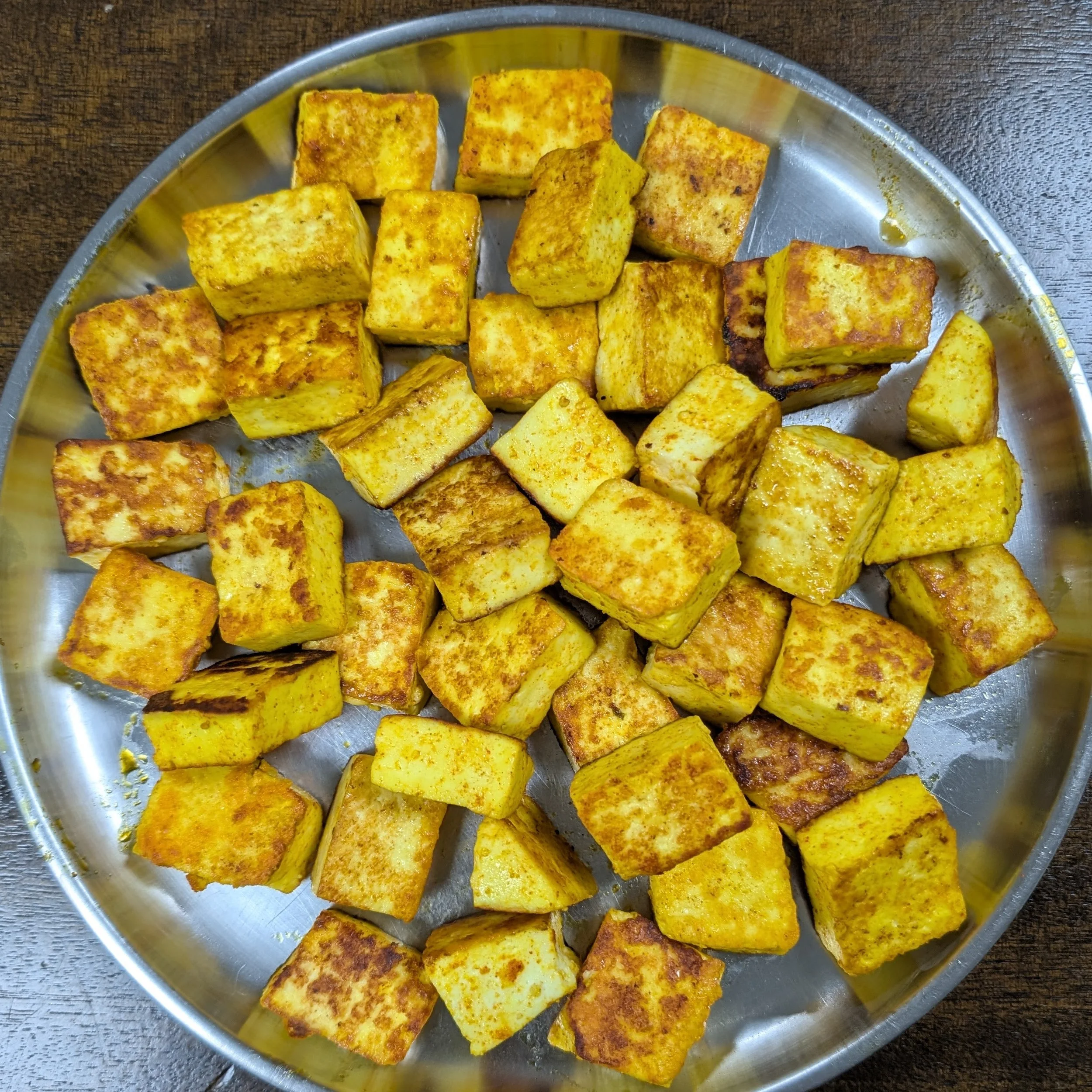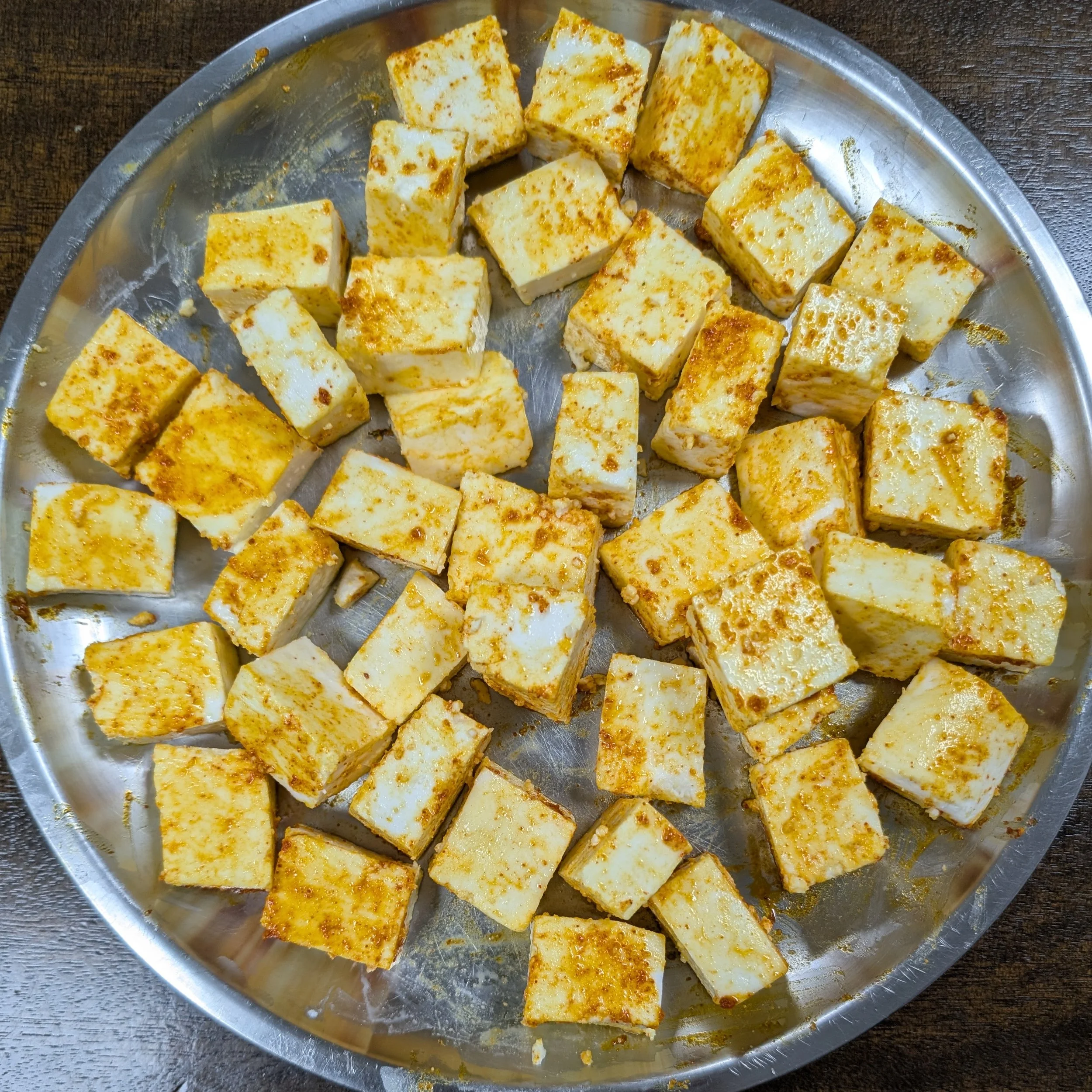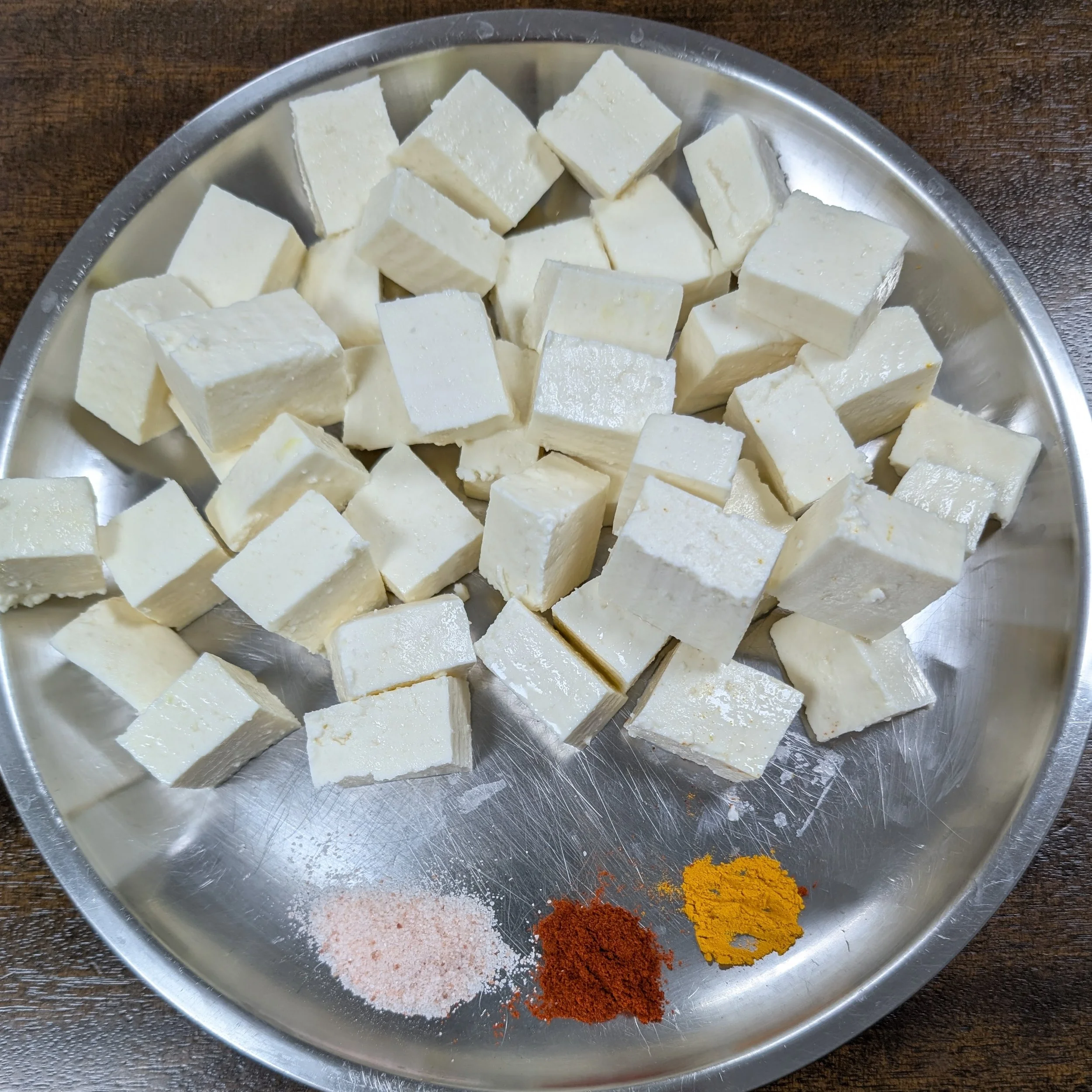 Cut the paneer into 1 inch square pieces. Add the turmeric, chilli powder and salt in the oil and then smear each paneer on both sides with the paste. Keep it aside for 10 minutes.
