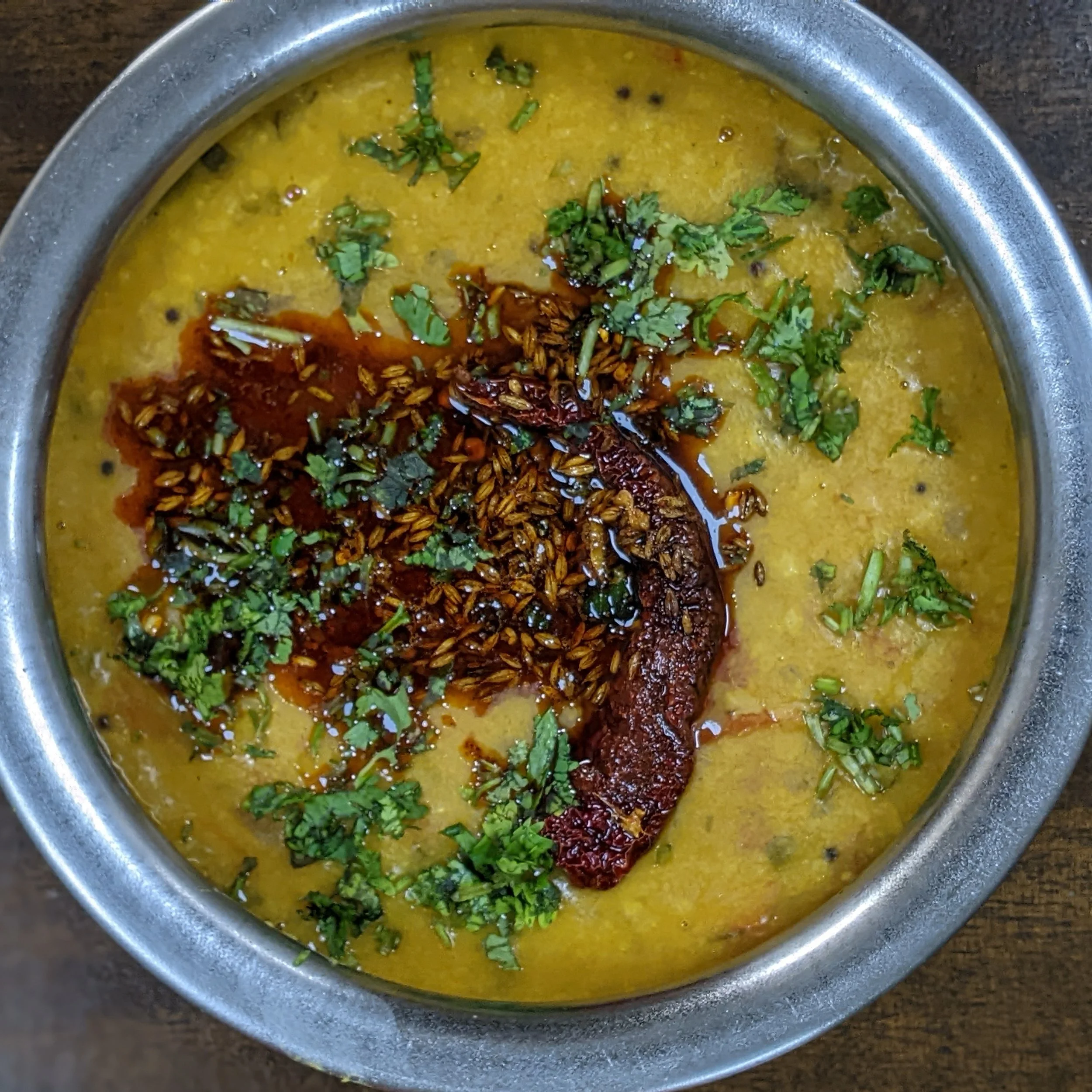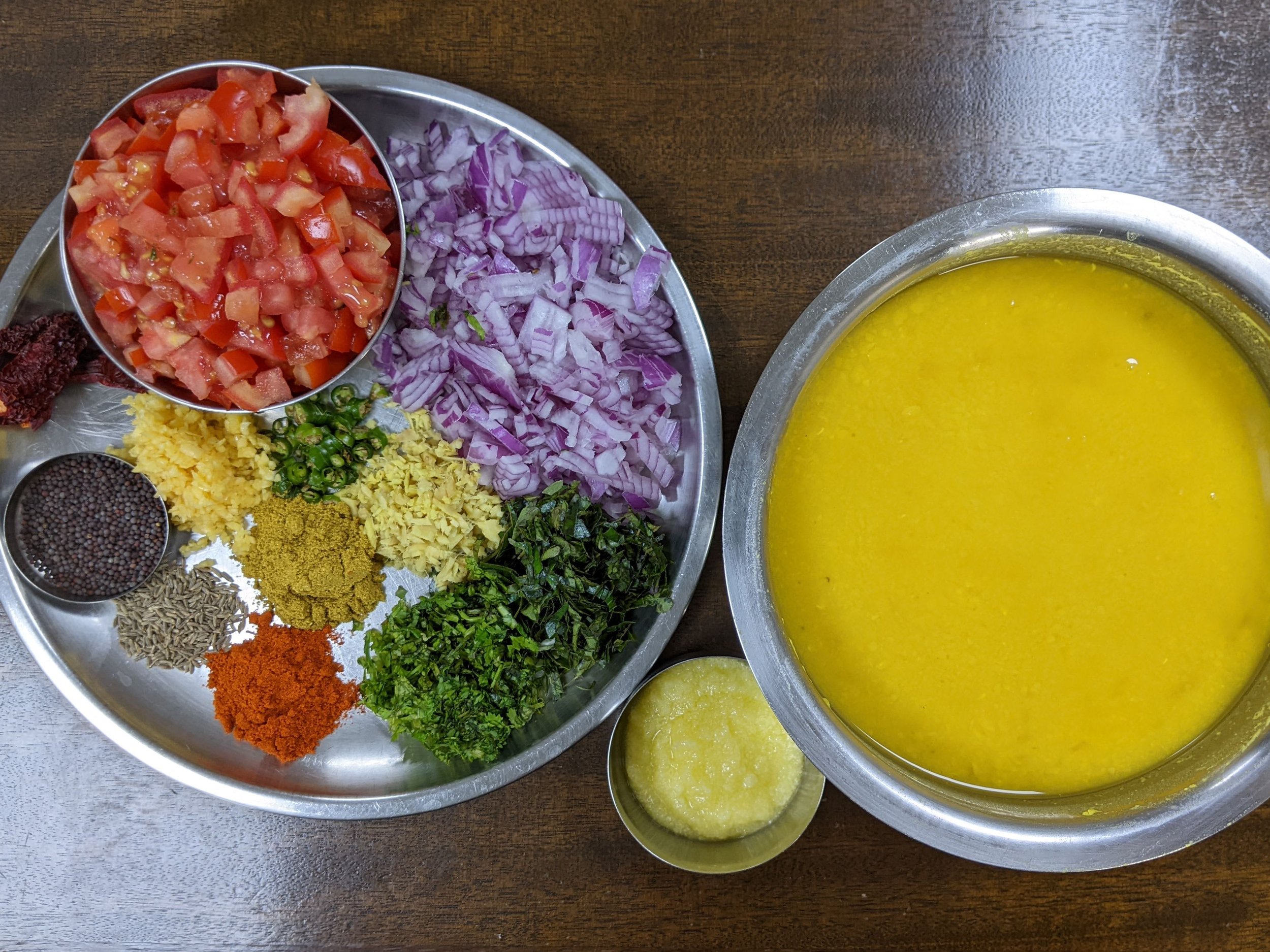 In a pan or kadai heat 2 tbsp ghee add the curry leaves, garlic and ginger saut for a second and then add the chopped onions. Saute till it is soft then add the tomatoes and cook till drops of ghee are seen on the sides of the kadai. Add the coriander powder half quantity of red chilli powder and the cooked dal and water if required. The consistency should be semi thick. Keep aside.
