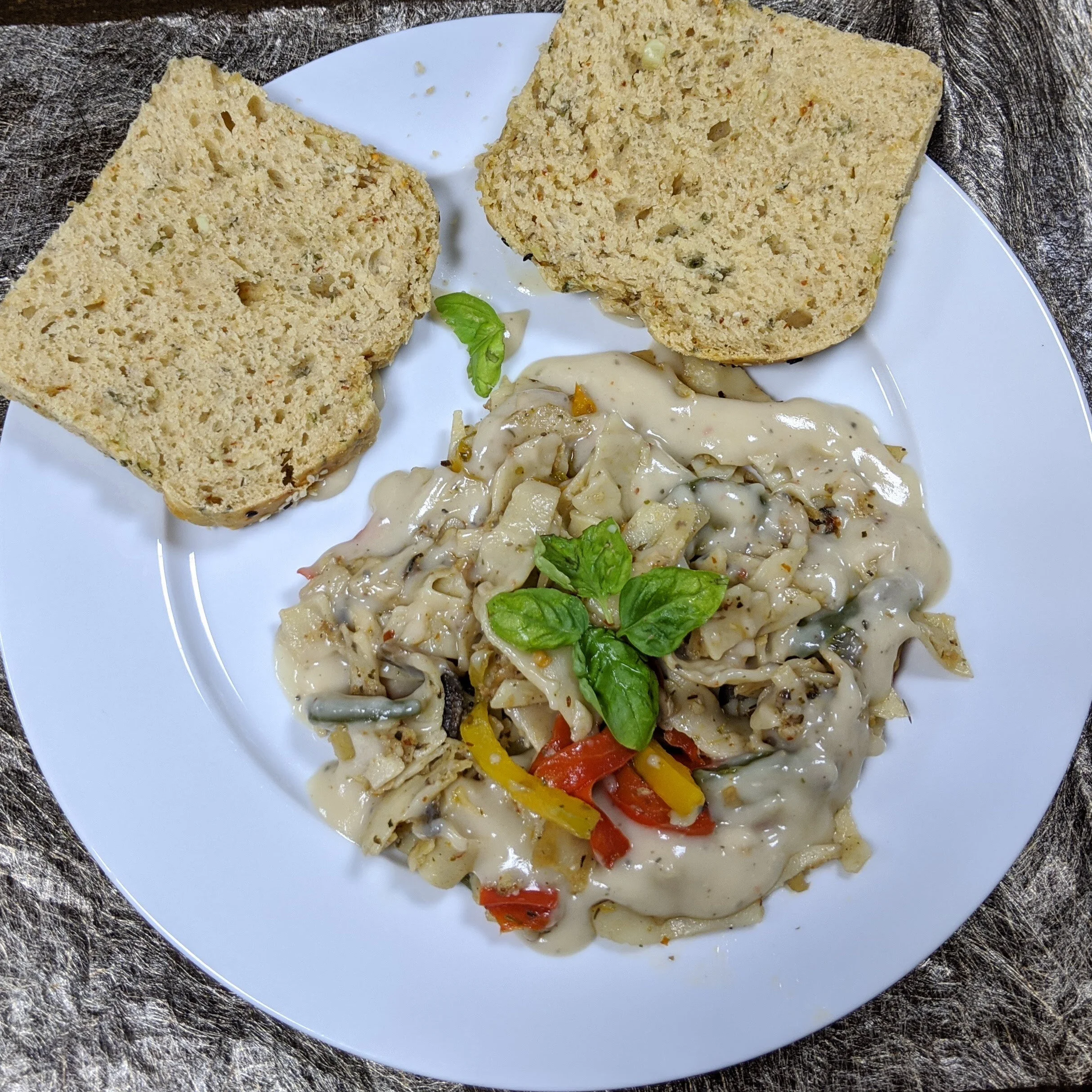 In another pan add 4 tbsp olive oil saute the garlic for 1-2 minutes then add the mushrooms and capsicums saute for another 5 minutes till they are soft but at the same time crunchy.