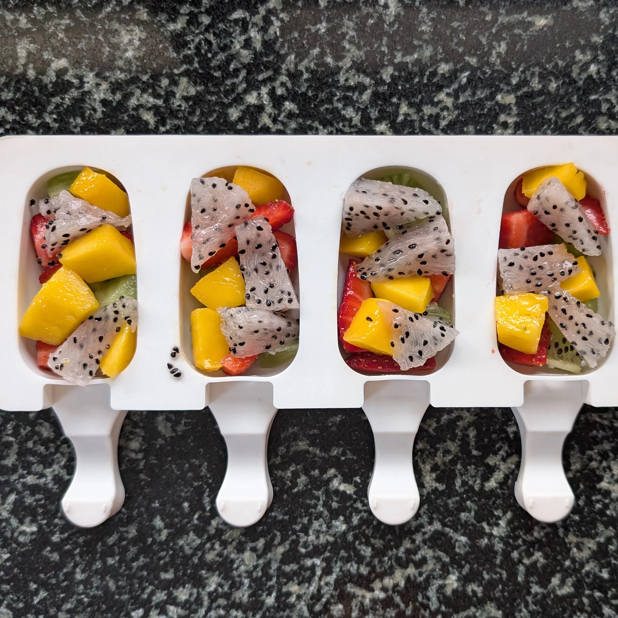 Take the popsicles tray or plastic / paper cups and place a few pieces of each fruit in them then pour the coconut water over the fruits ensuring that they are properly covered.