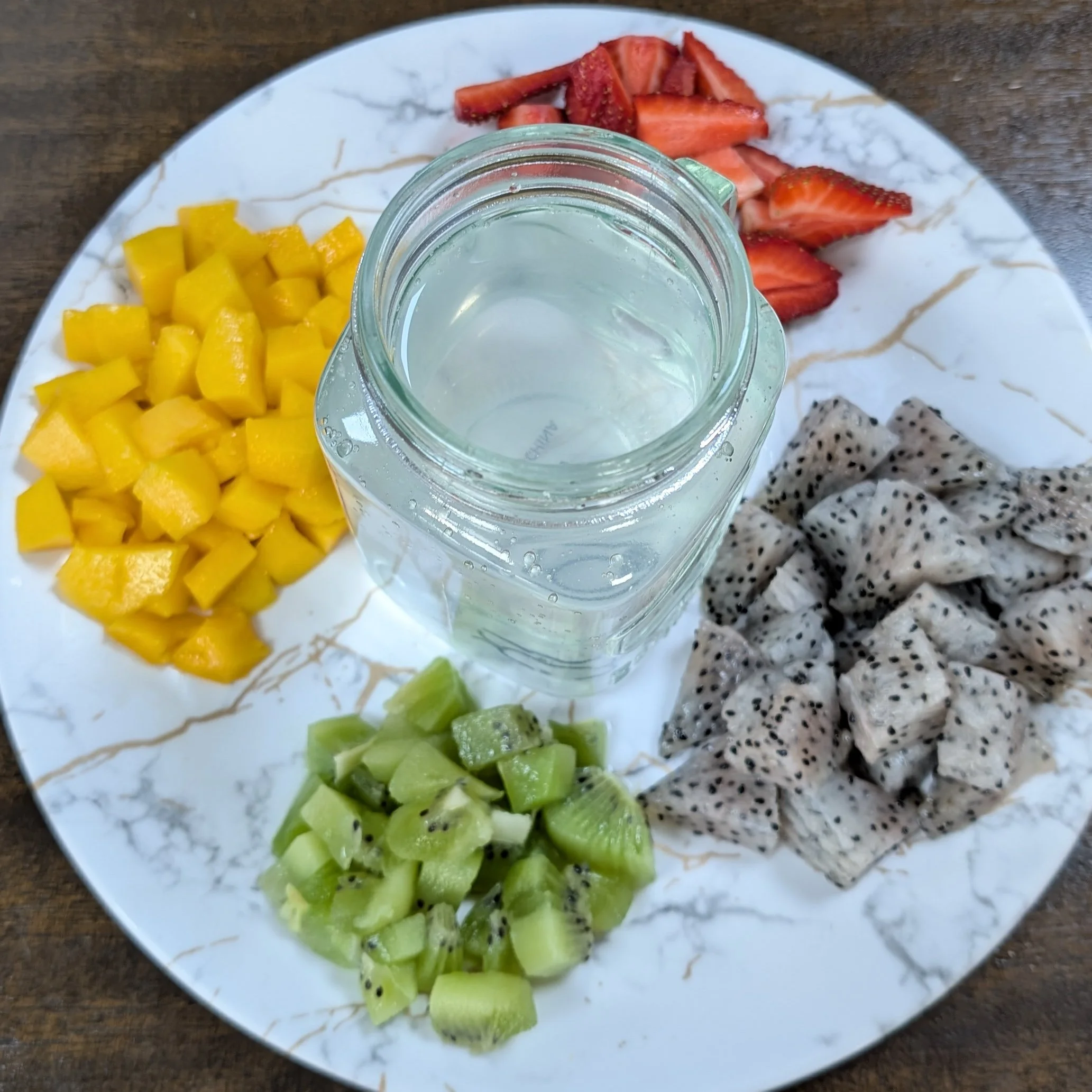 Peel the mango, kiwi and dragon fruit then chop them into small cubes.