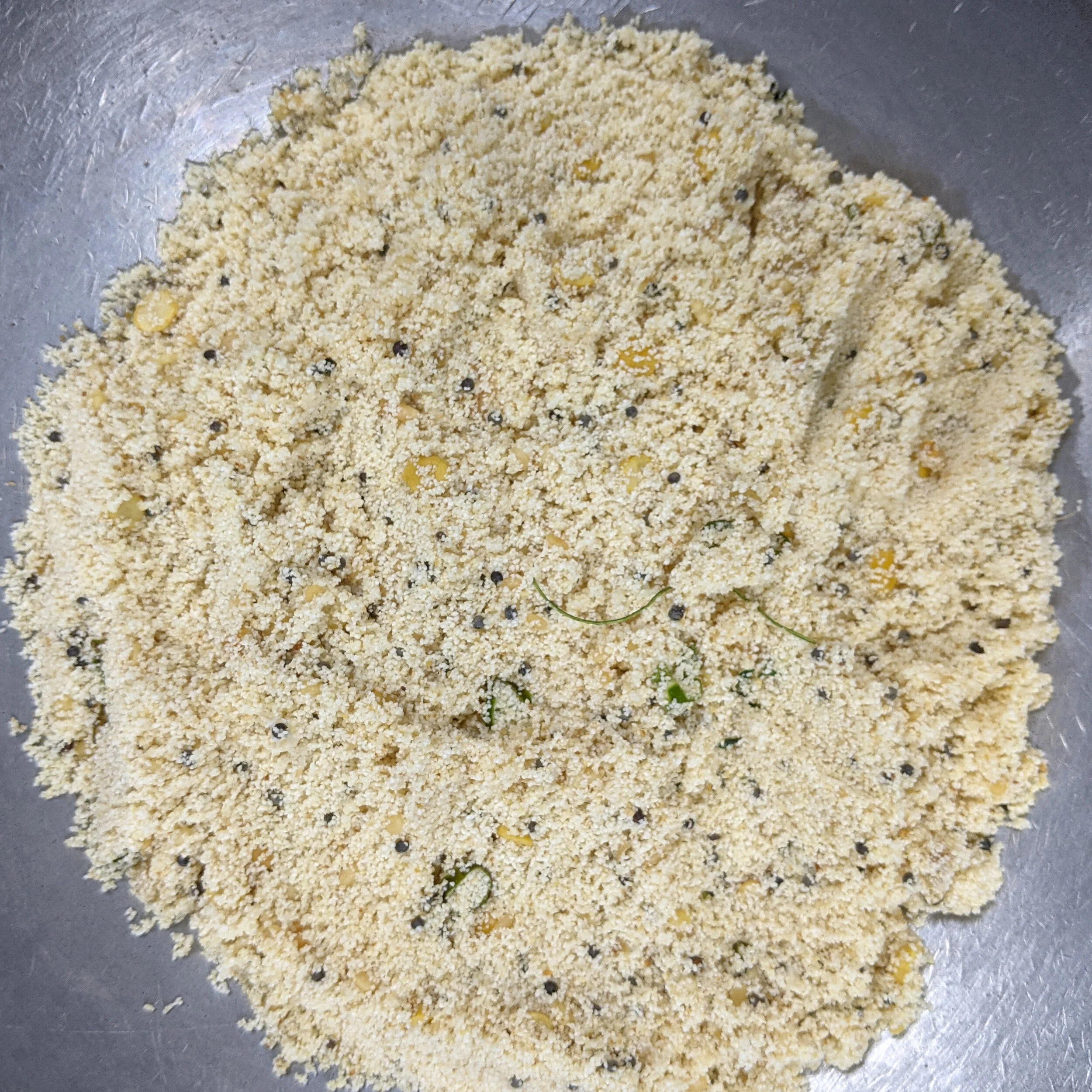 In a pan heat 1 tbsp oil add the mustard seeds when it splutters add both the dals. Cook till soft then add the curry leaves, red chillies,ginger, green chillies and rawa. Roast on low flame stirring at intervals till the rawa turns light golden in colour. Remove in a plate and keep aside.