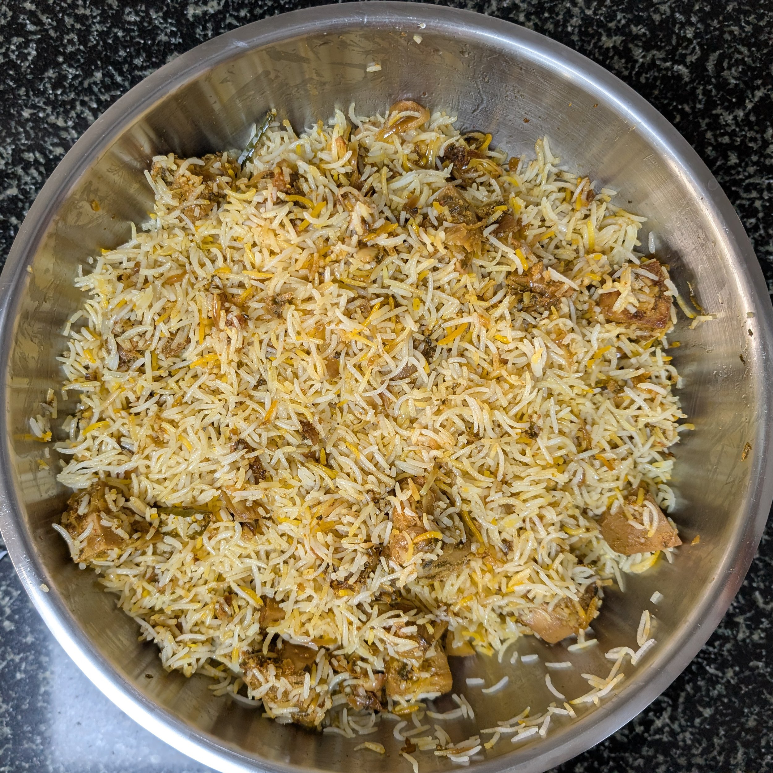 Place the vessel on a tawa and cook the biryani on low flame for 15 minutes. Remove from flame and let it be covered for another 10 minutes.