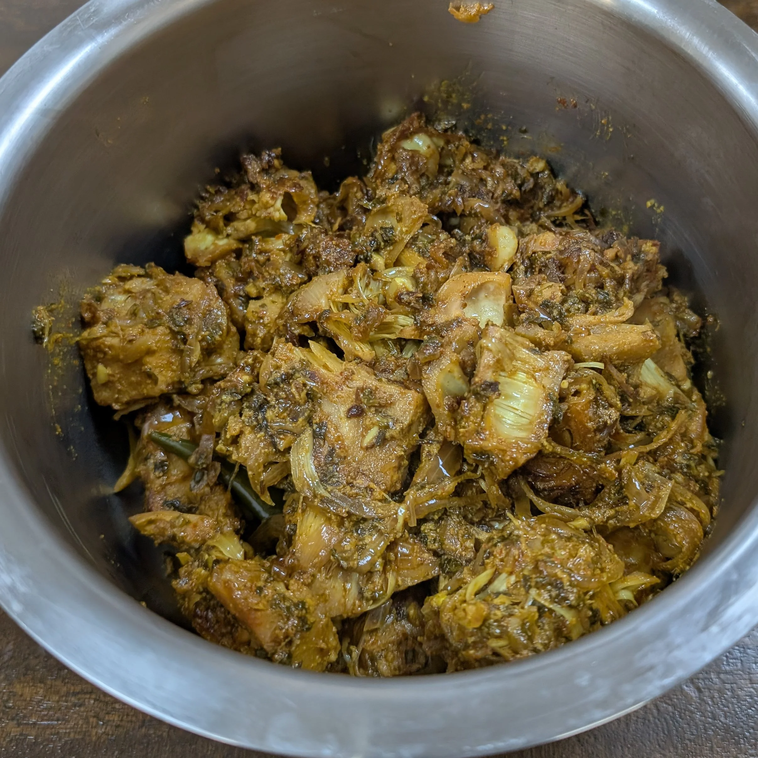 In a heavy based vessel heat 6 tbsp oil then fry the chopped onions till pink in colour. To it add the marination with 1/4 cup water then cover and cook on low flame stirring at intervals till the kathal is soft. Remove from flame and keep aside for future.