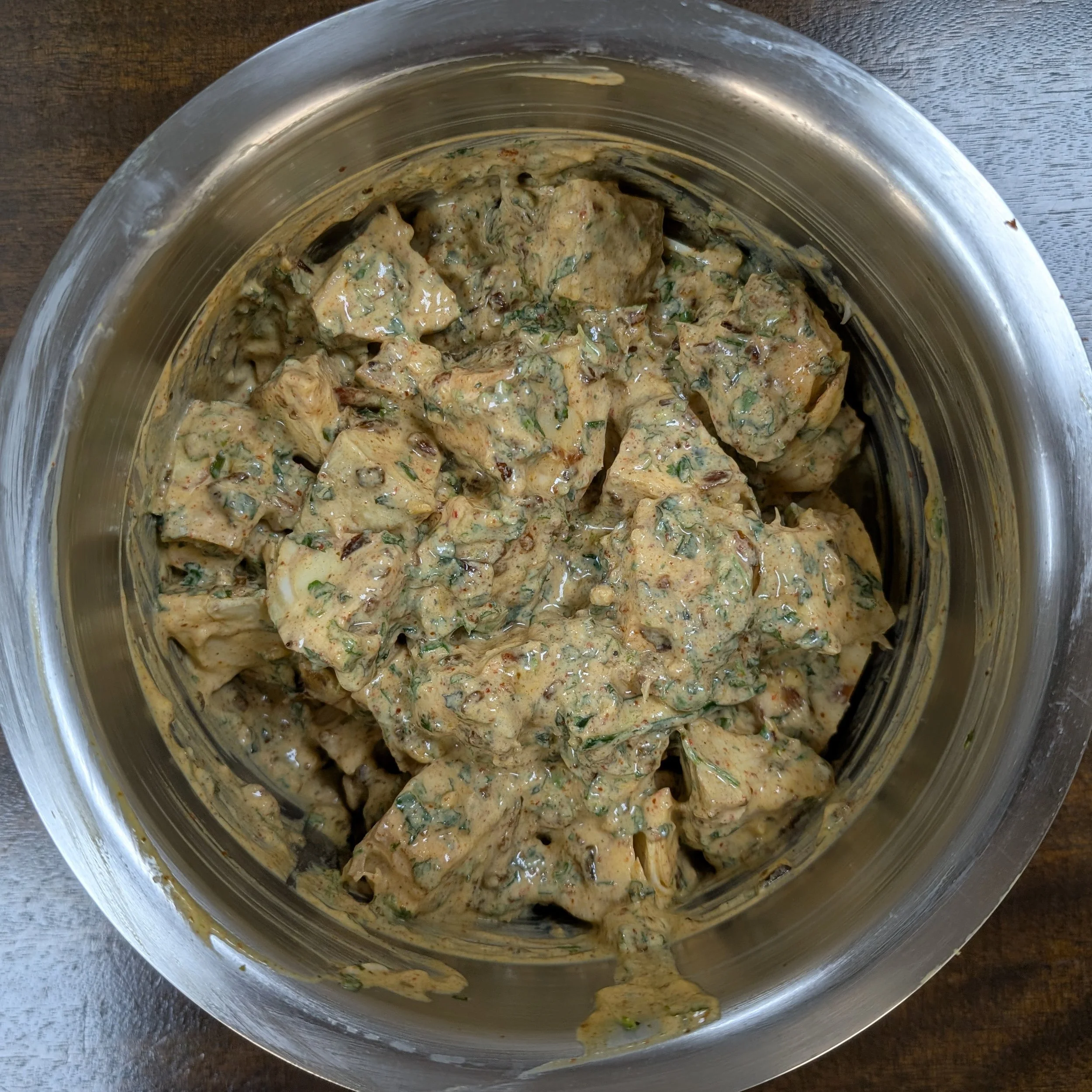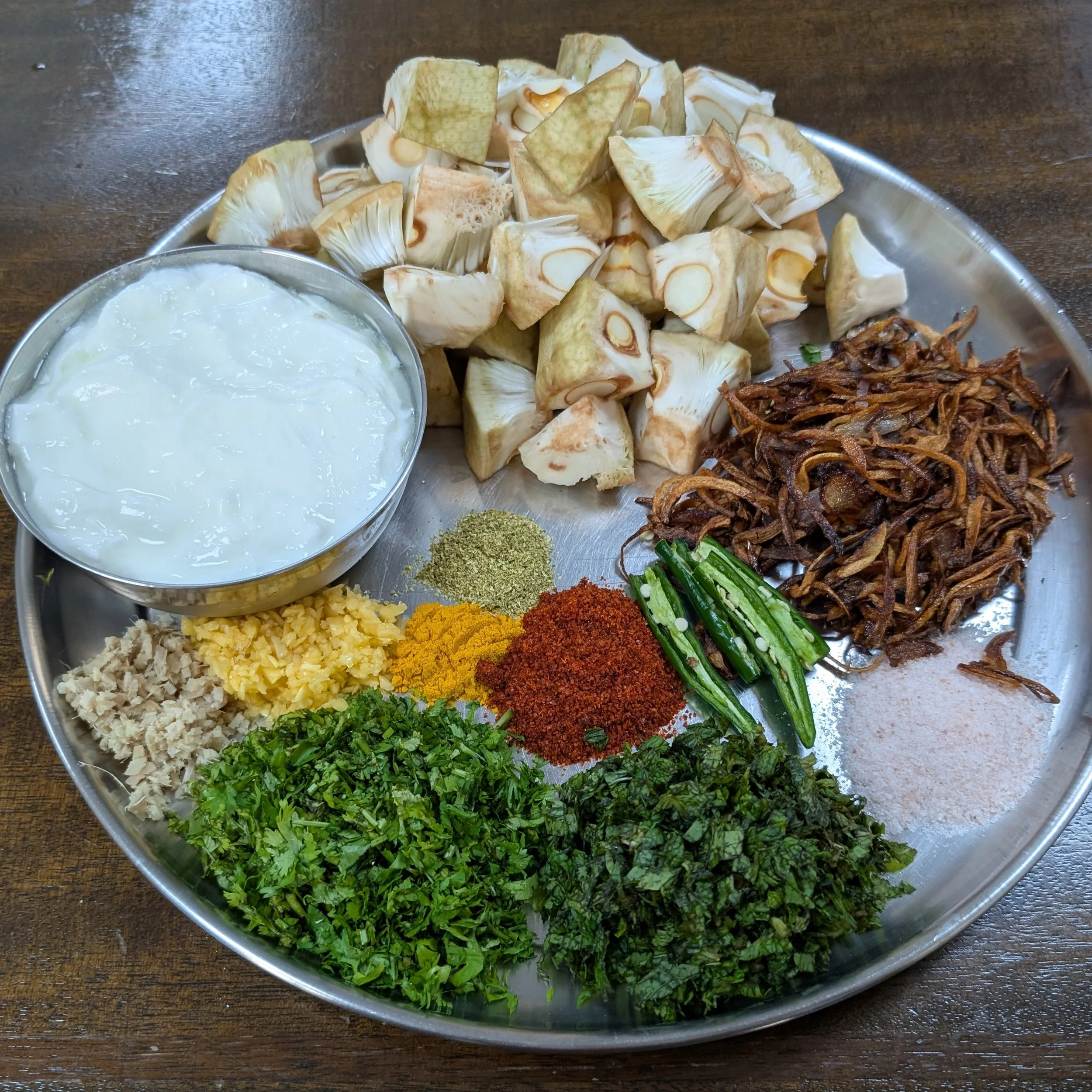 In a bowl add the curds, fried and crushed onions , chopped coriander ,pudina leaves , salt, ginger, garlic, chopped green chillies, cut kathal and all the spices for the marination. Keep it aside for half an hour.