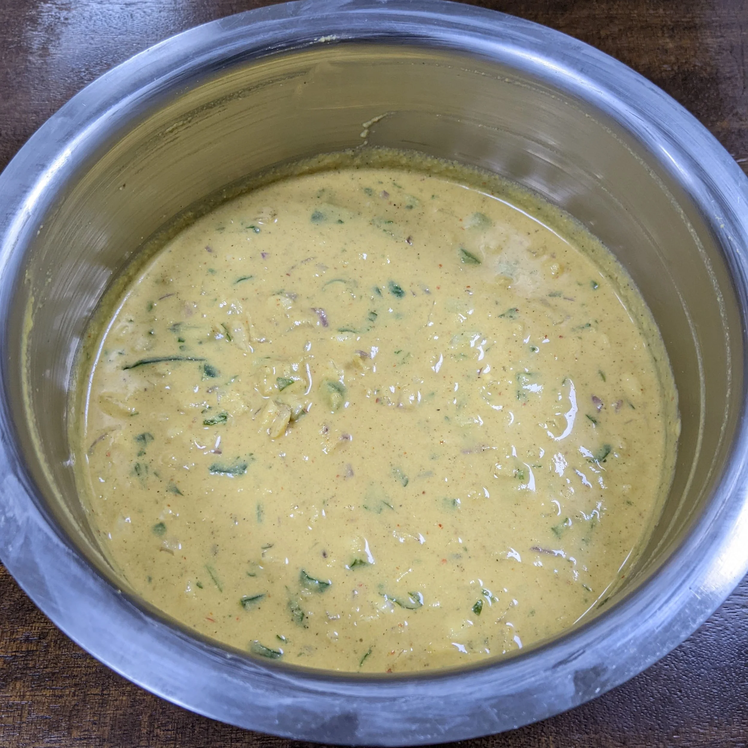 After the rest time mix the chopped onions, cabbage, capsicum, green chilies, coriander leaves and soda . The batter has to be dropping consistency so if it is too thick a little more water can be added.