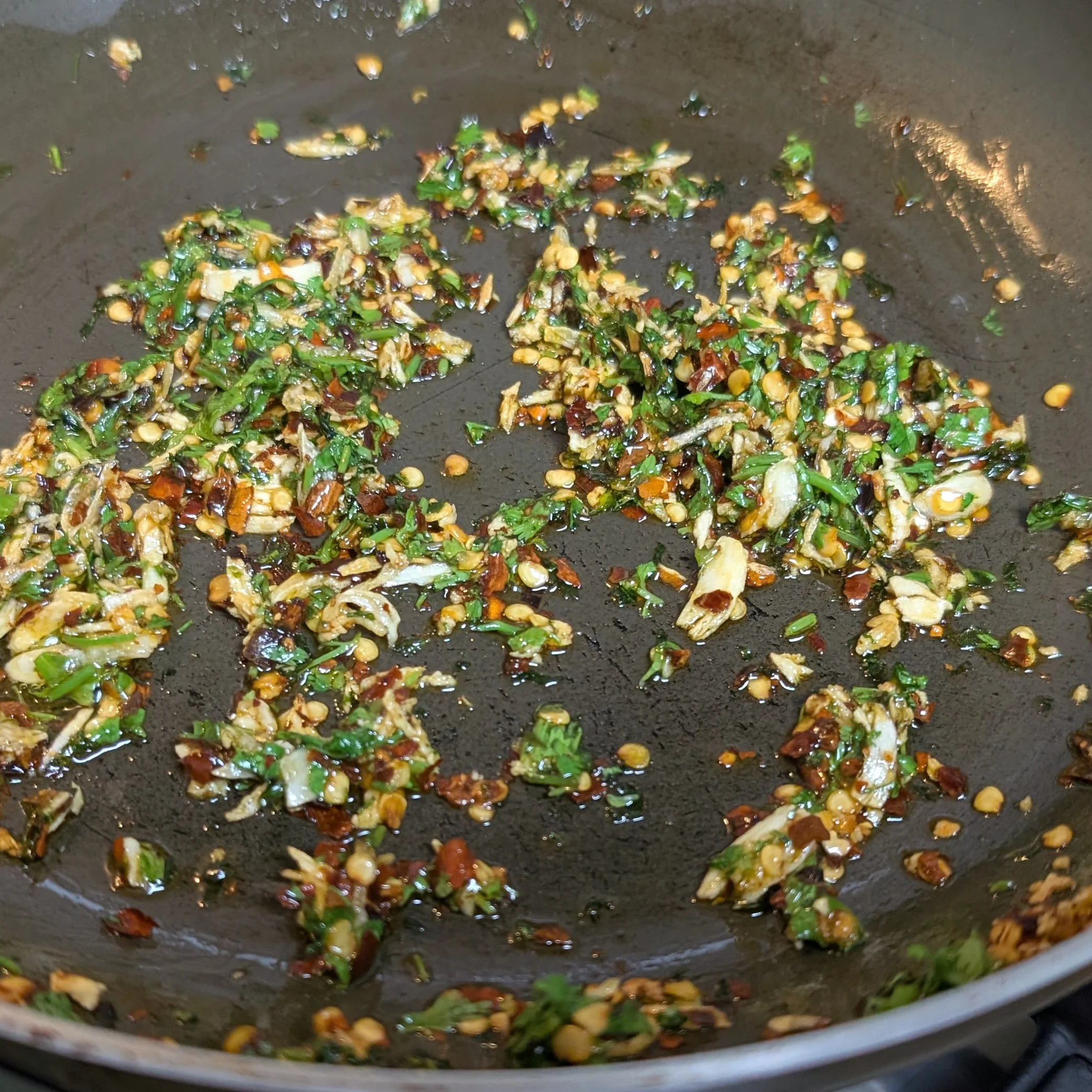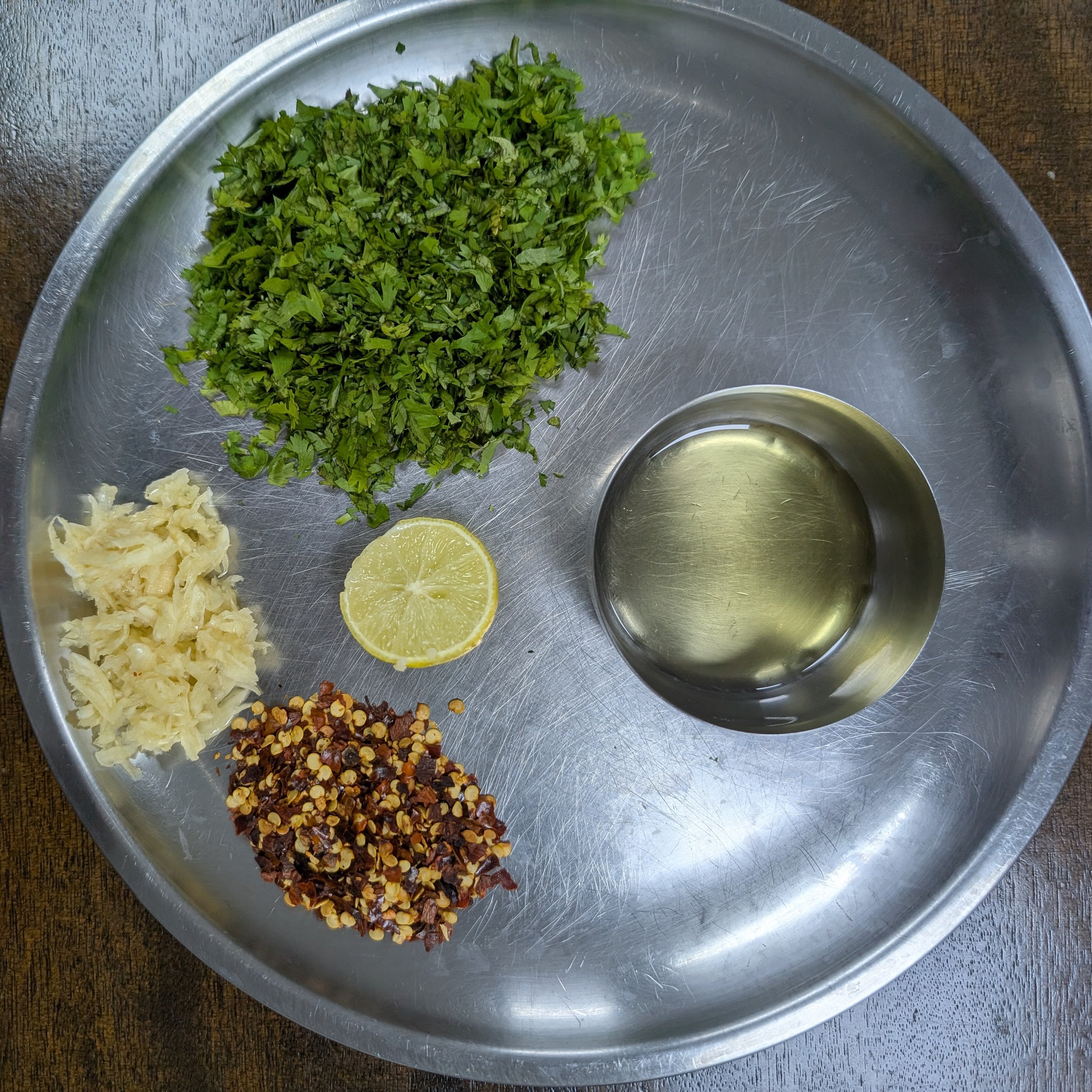 In a pan heat the remaining oil then saute the crushed garlic for a few seconds. To it add the 3/4 quantity of the chopped coriander leaves and cook for a second then add the chilli flakes for another second.Switch off the gas.