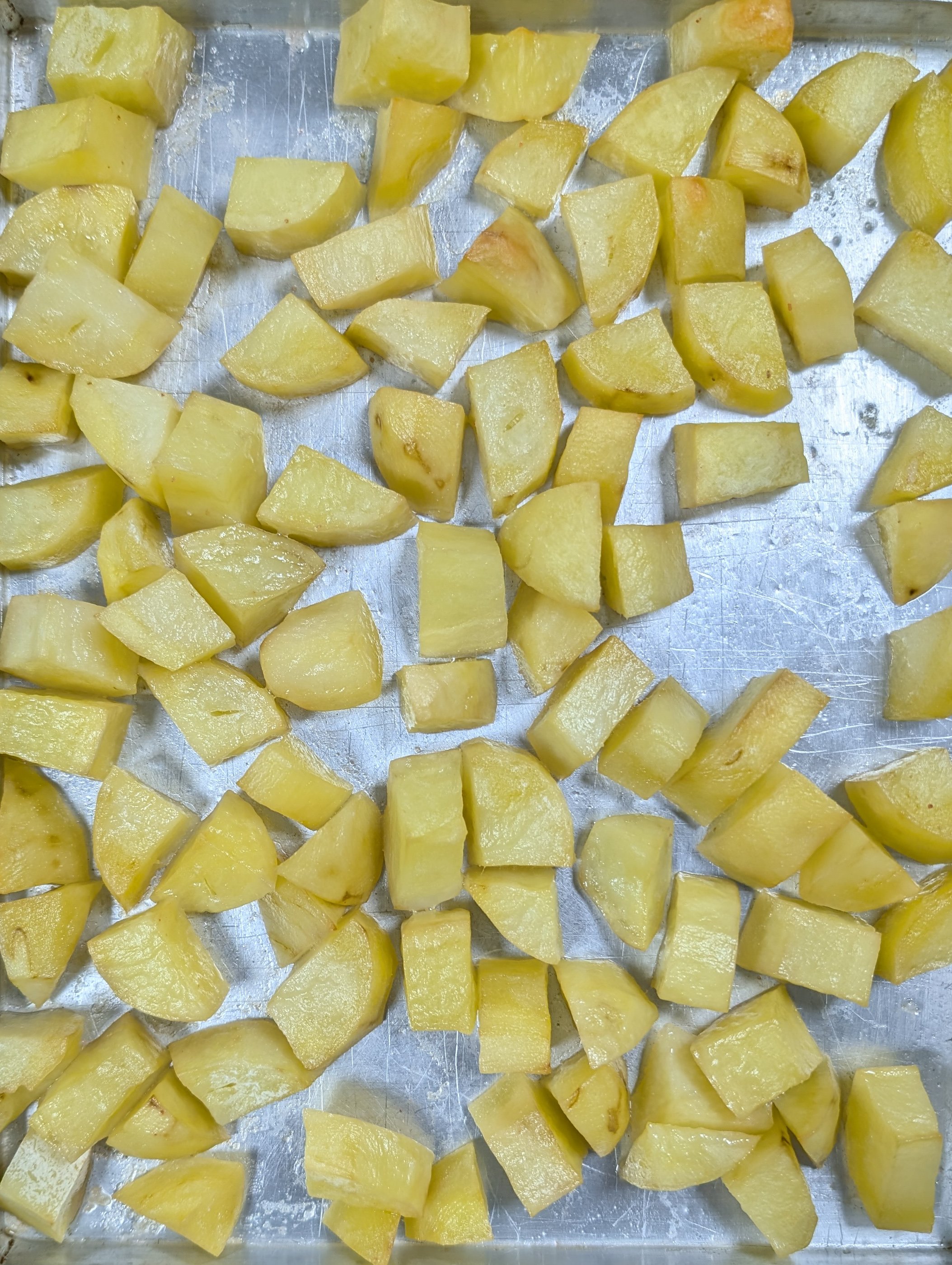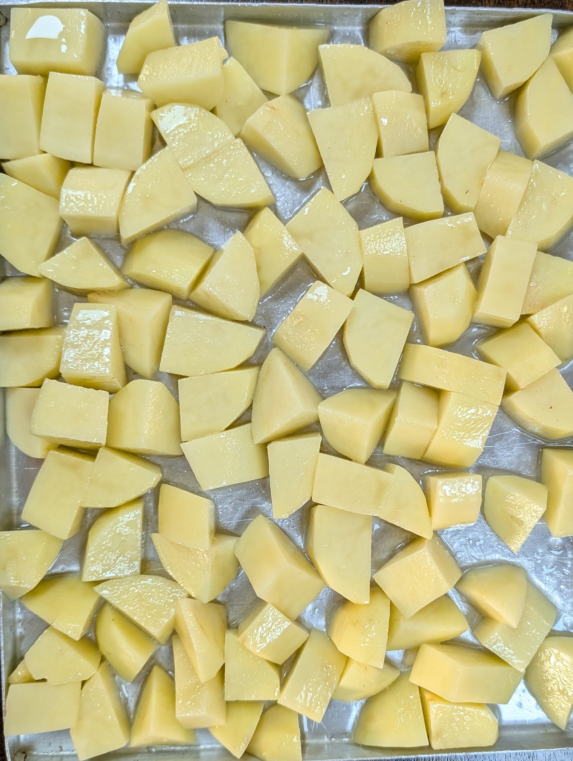 In a tray place all the chopped dry potatoes cubes and then sprinkle some salt and oil all over them.