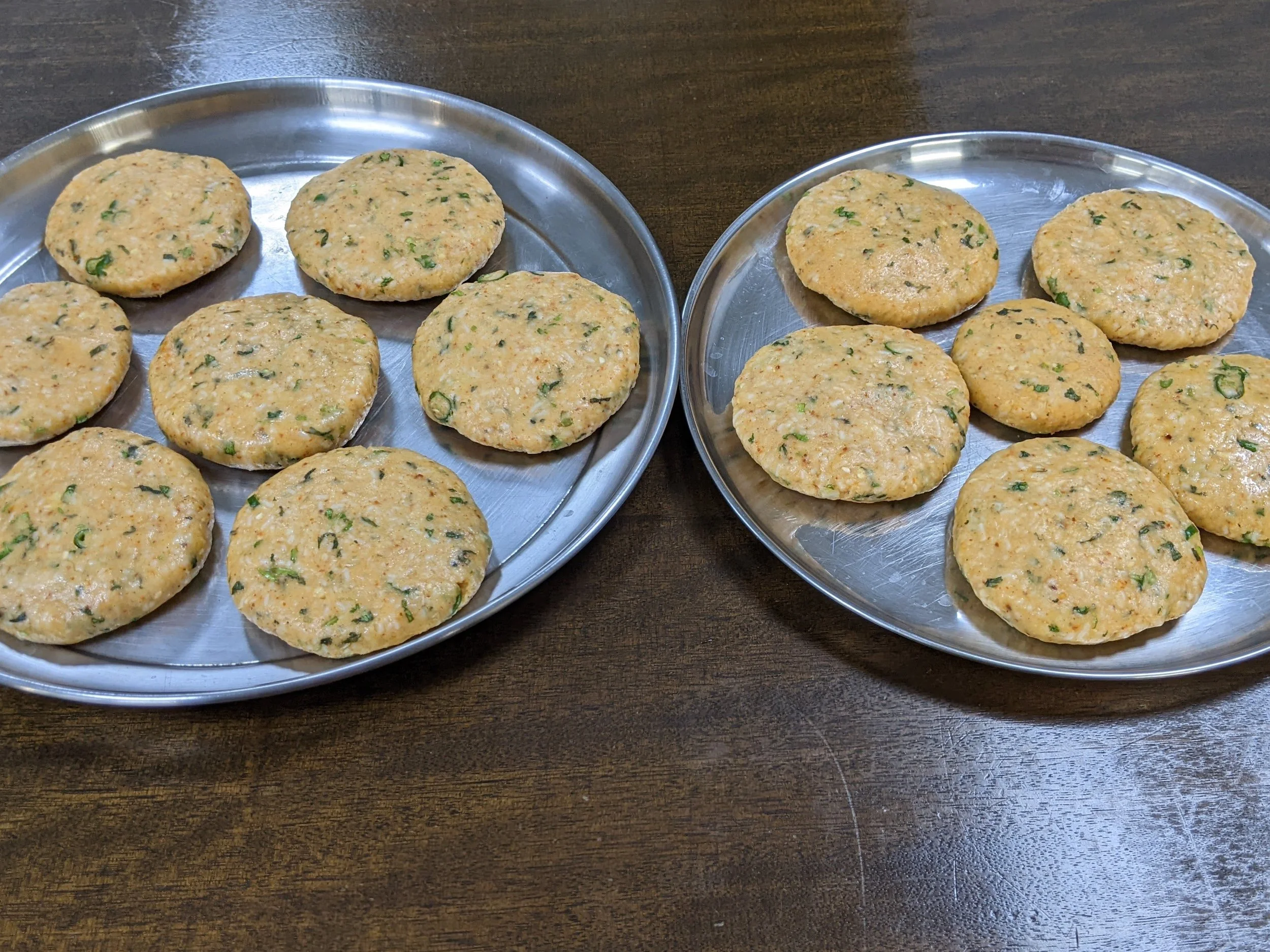 Grease your palms with some oil and roll into round balls and then flatten them .