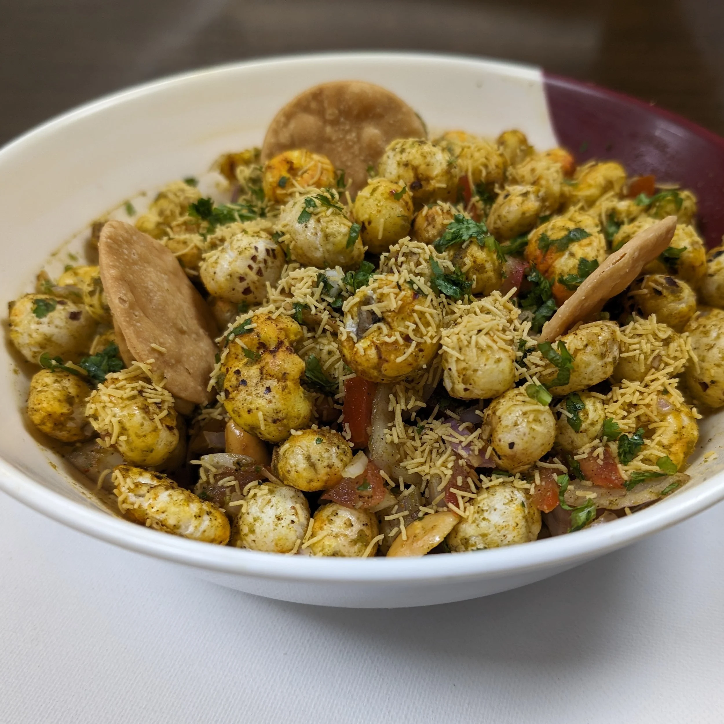 To the makhana and peanuts add the chopped onions, tomato, green chilli, salt, chaat masala, sweet chutney, green chutney then give it a good mix. Break the puris in it and then garnish it with chopped coriander leaves and sev.