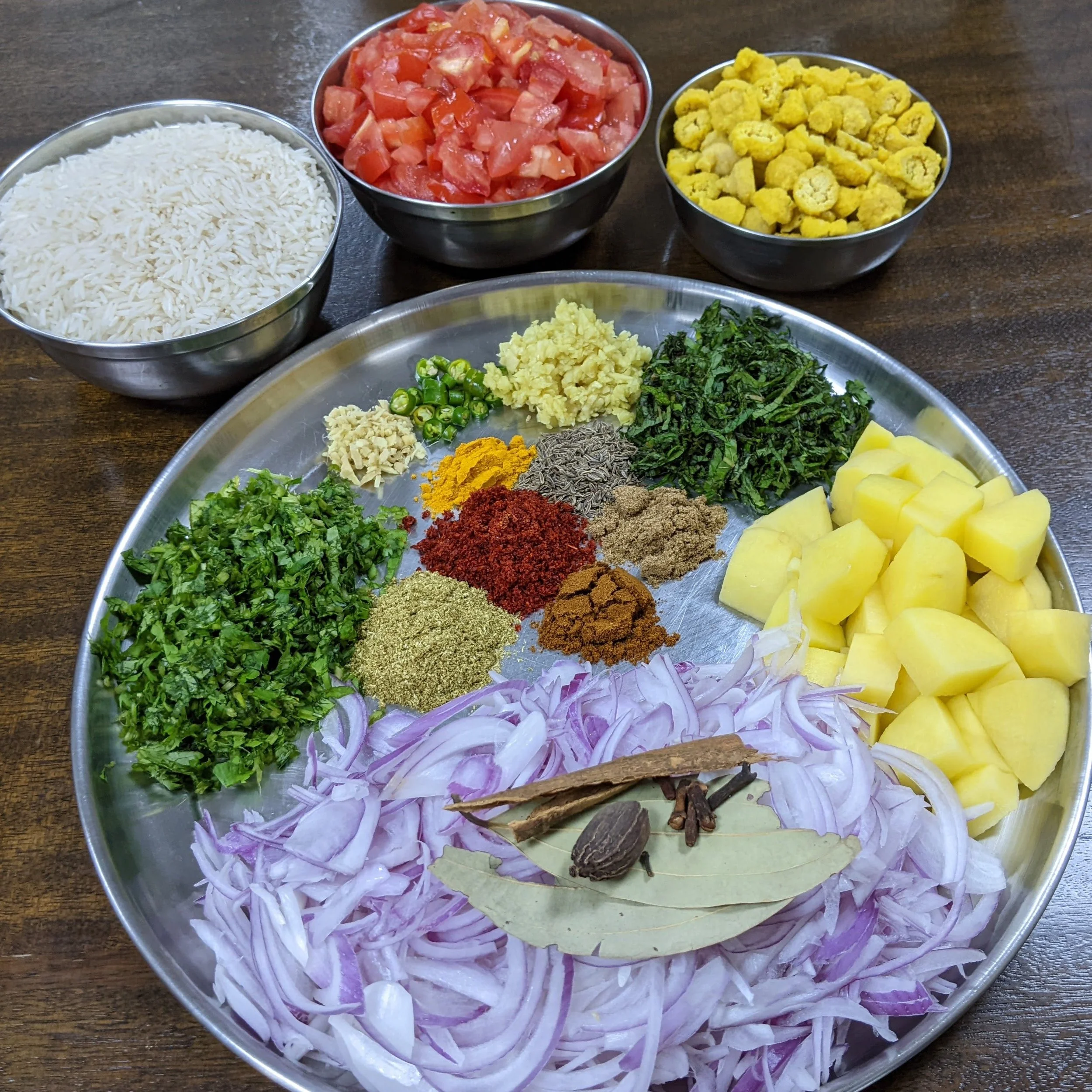 In a pressure cooker heat 1/4 cup oil then add the jeera when it splutters add the tej patta, cinnamon, cardamom and cloves. Then add the garlic and ginger saute them for a second and then add the sliced onions and cook on medium to low flame till golden brown in colour. Add the chopped tomatoes, green chillies, pudina leaves, all the dry spices and salt. Cook till the tomatoes are soft and mushy.