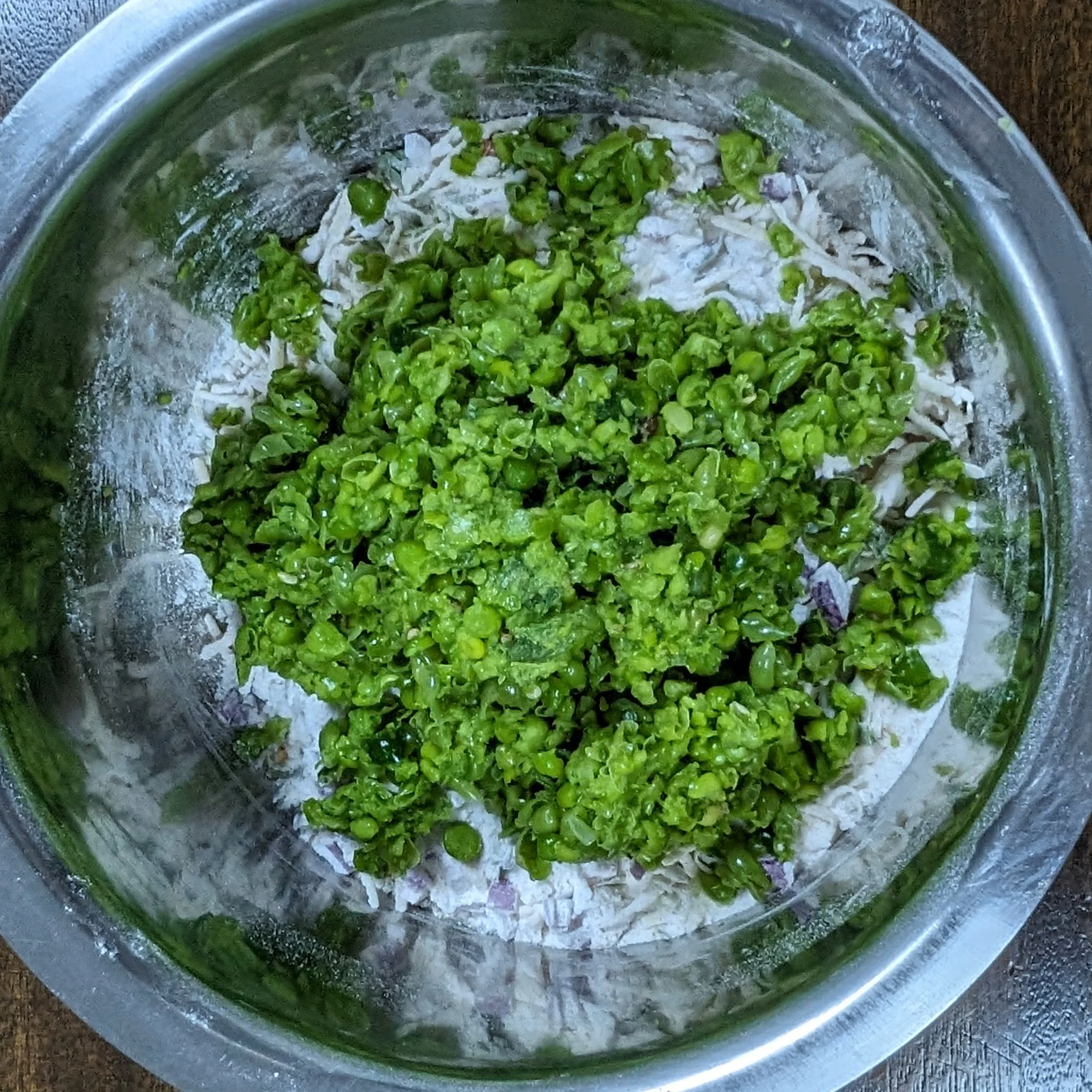 In a bowl add rice flour, matar paste, chopped onion, grated potato, chopped coriander leaves, salt, curds and all the dry spices. Mix well and then add water as needed to form a dropping consistency batter.