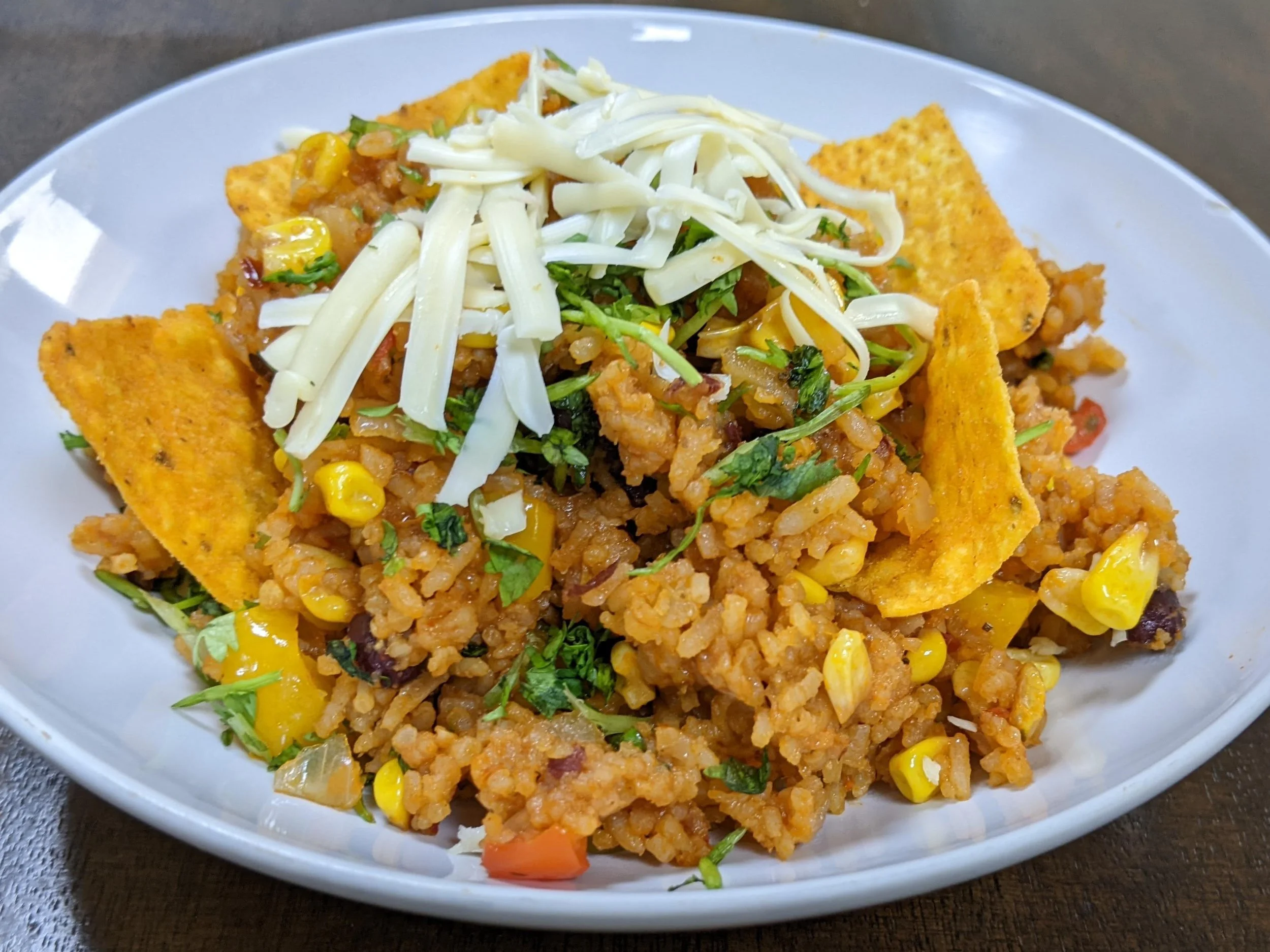 Remove in a serving bowl and garnish with some chopped spring onions, grated cheese and tortilla chips.