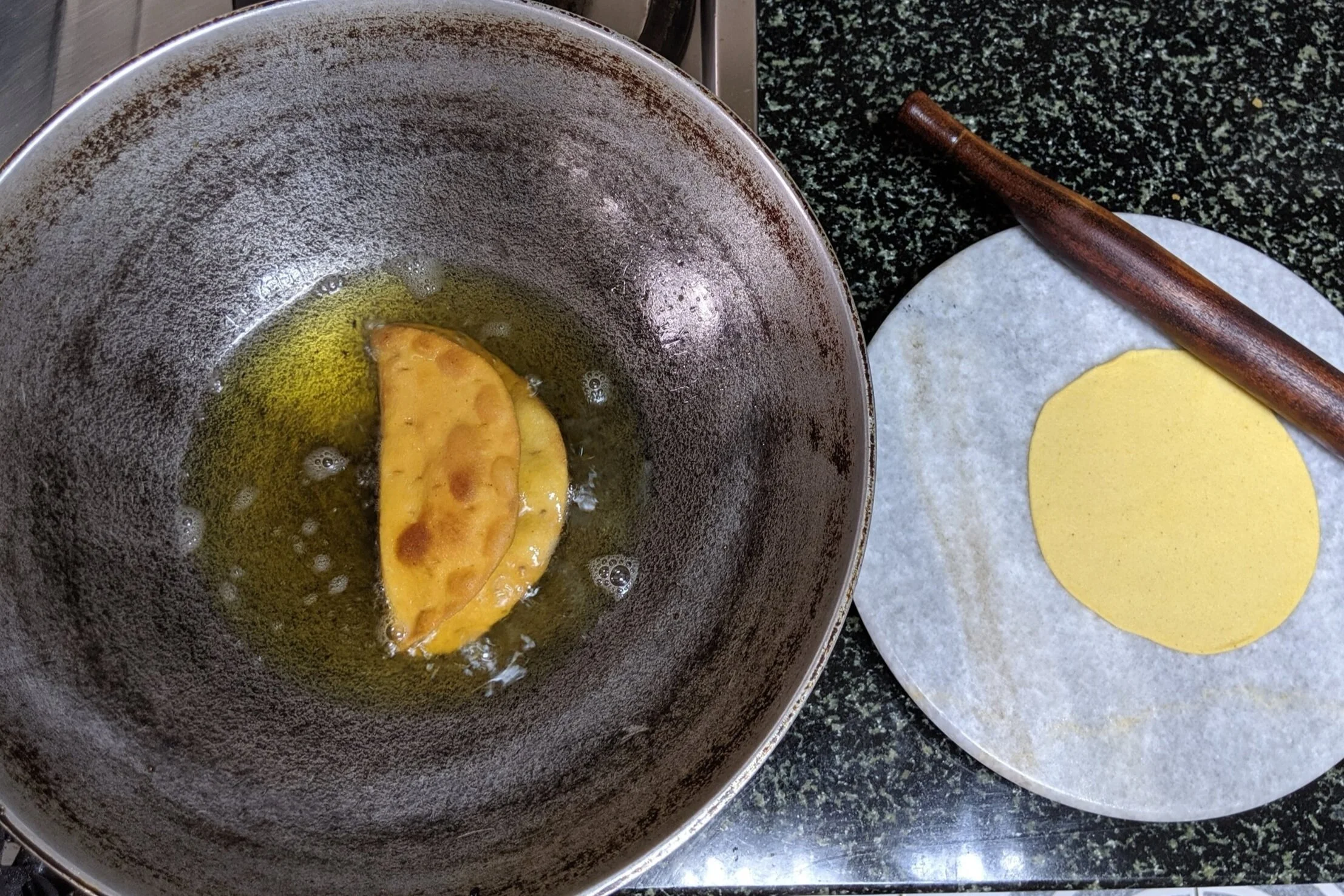 In a kadai heat some oil and deep fry the rolled chapati on medium flame on one side then flip and give it a fold from the center .Fry till it is cooked and golden brown on both sides. Remove and keep aside .Repeat the process till all the taco shells are ready .