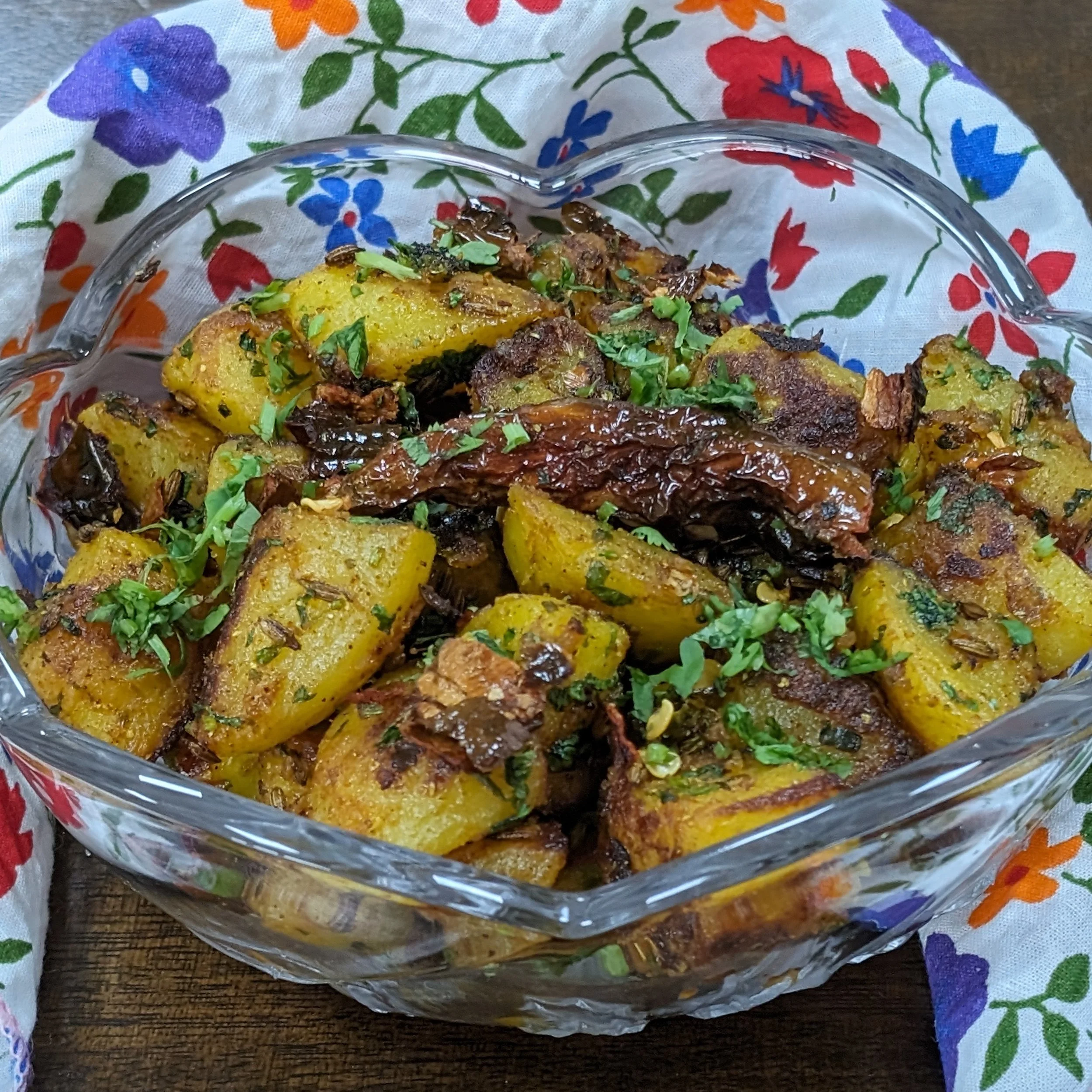 In a kadai heat the mustard oil add the whole red chilli and jeera when it splutters add the asefodita and chopped potatoes.