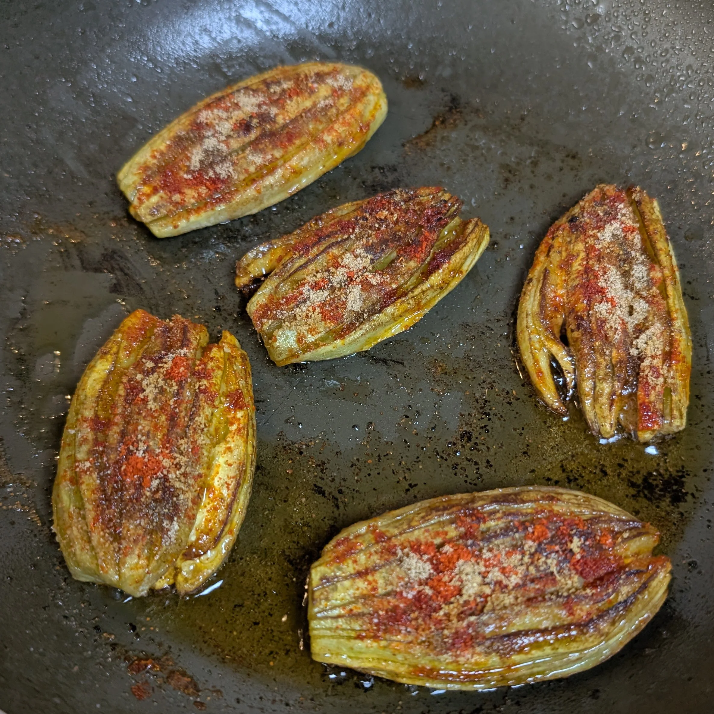 In a non stick pan heat some oil then place one by one all the parwal on it. Cover and cook on low flame till soft and slightly brown in colour. Sprinkle some masala on each one of the parwal. Flip and cook on low flame on the other side too. Sprinkle some masala on it.