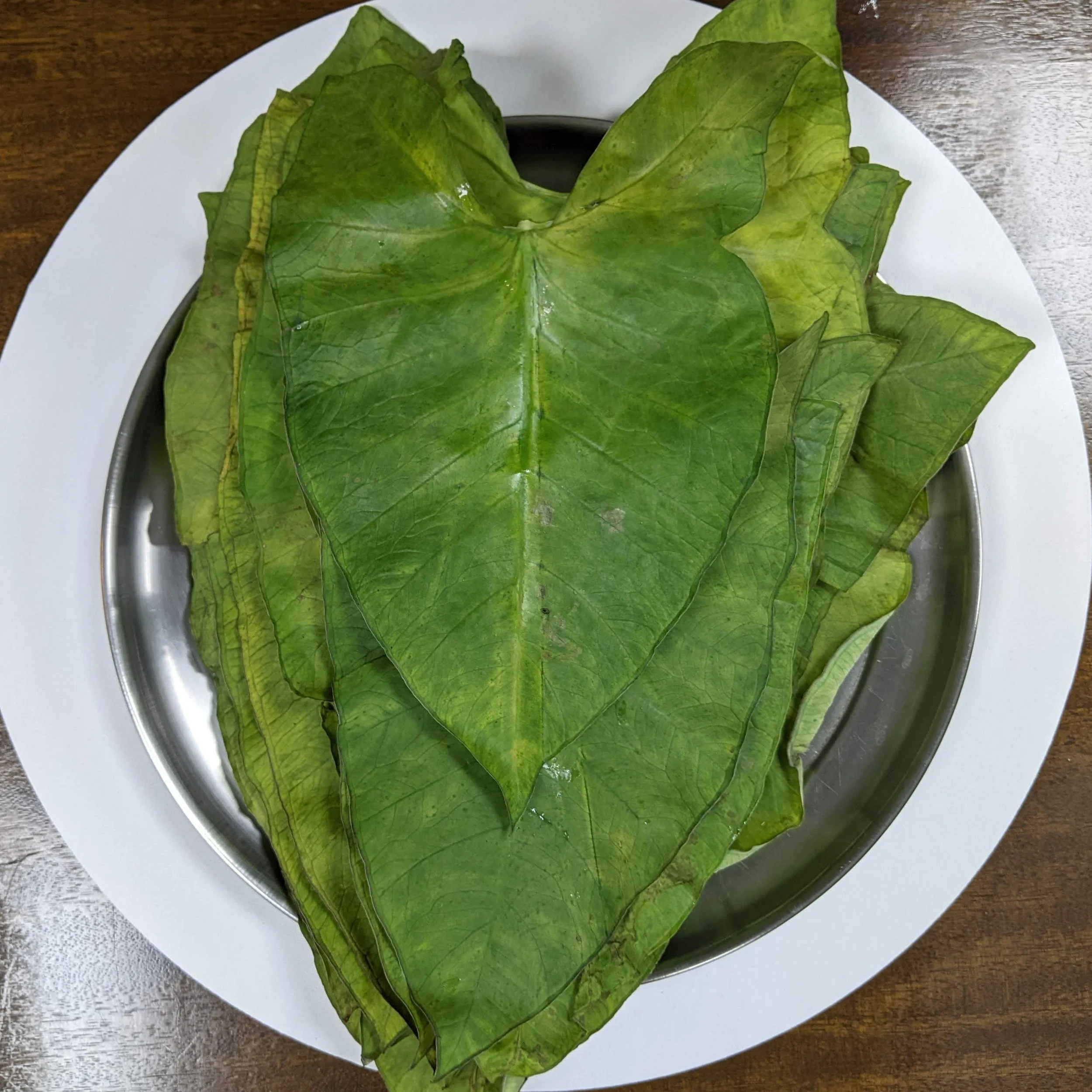 Remove all the stalks of the patra leaves and wash them. Dry pat all the leaves.