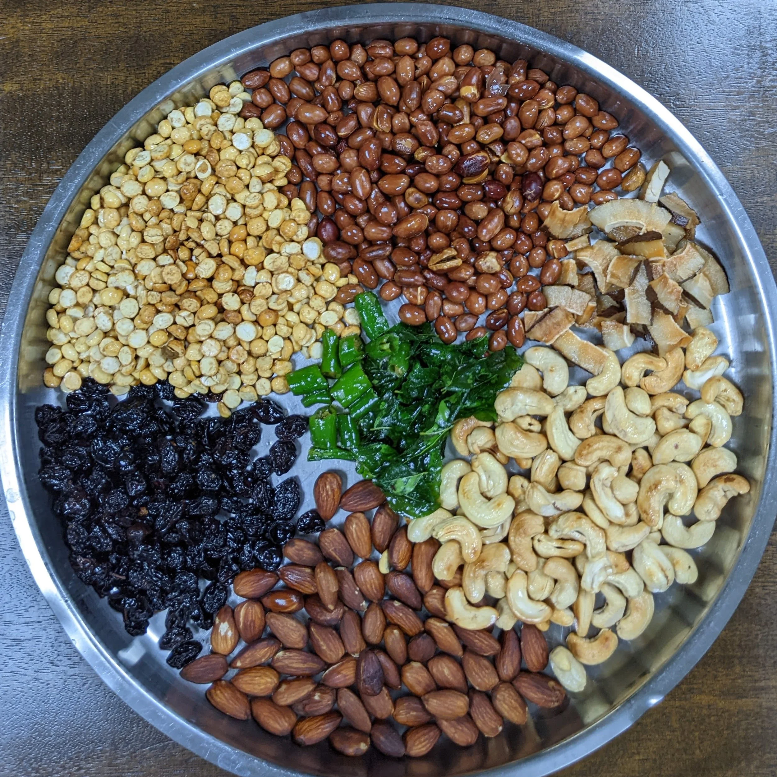 In a kadai heat 1/4 cup oil and deep fry the almonds, then cashewnuts, peanuts, chana dal, raisins, coconut chips, green chillies and curry leaves in the same order till golden brown in colour. Remove on a kitchen towel .