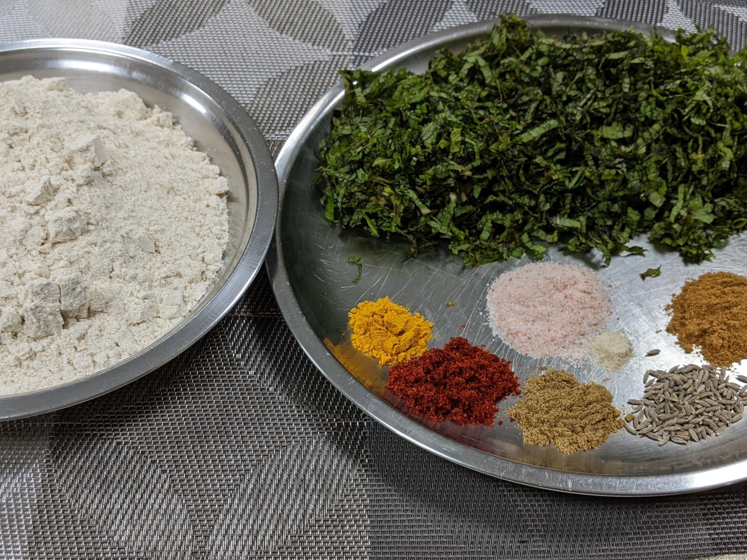 In a bowl add the atta, chopped pudina and all the dry spices. Mix and add water little by little to make a semi soft dough.Allow it to rest fro 10 minutes.