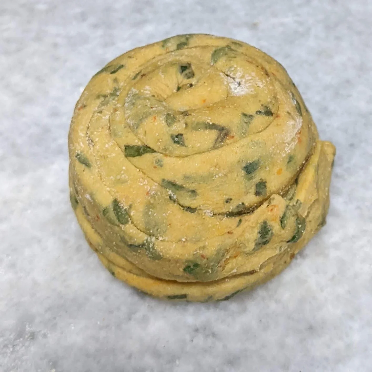 Take one ball and with a rolling pin roll gently roll into a medium thickness paratha.