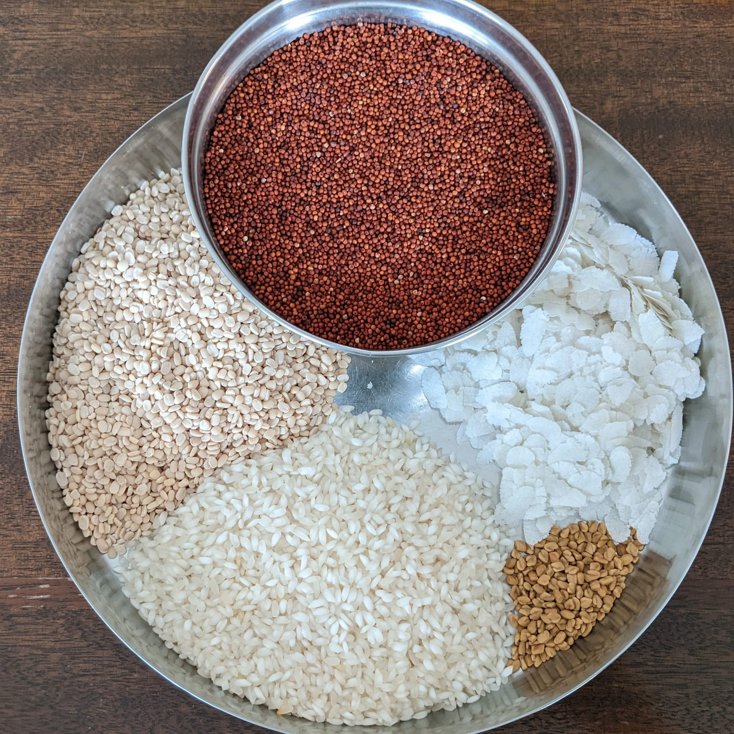 Add all the above ingredients together leaving out the poha and salt. Wash with water several times till the water is clean. Soak for 3-4 hours.