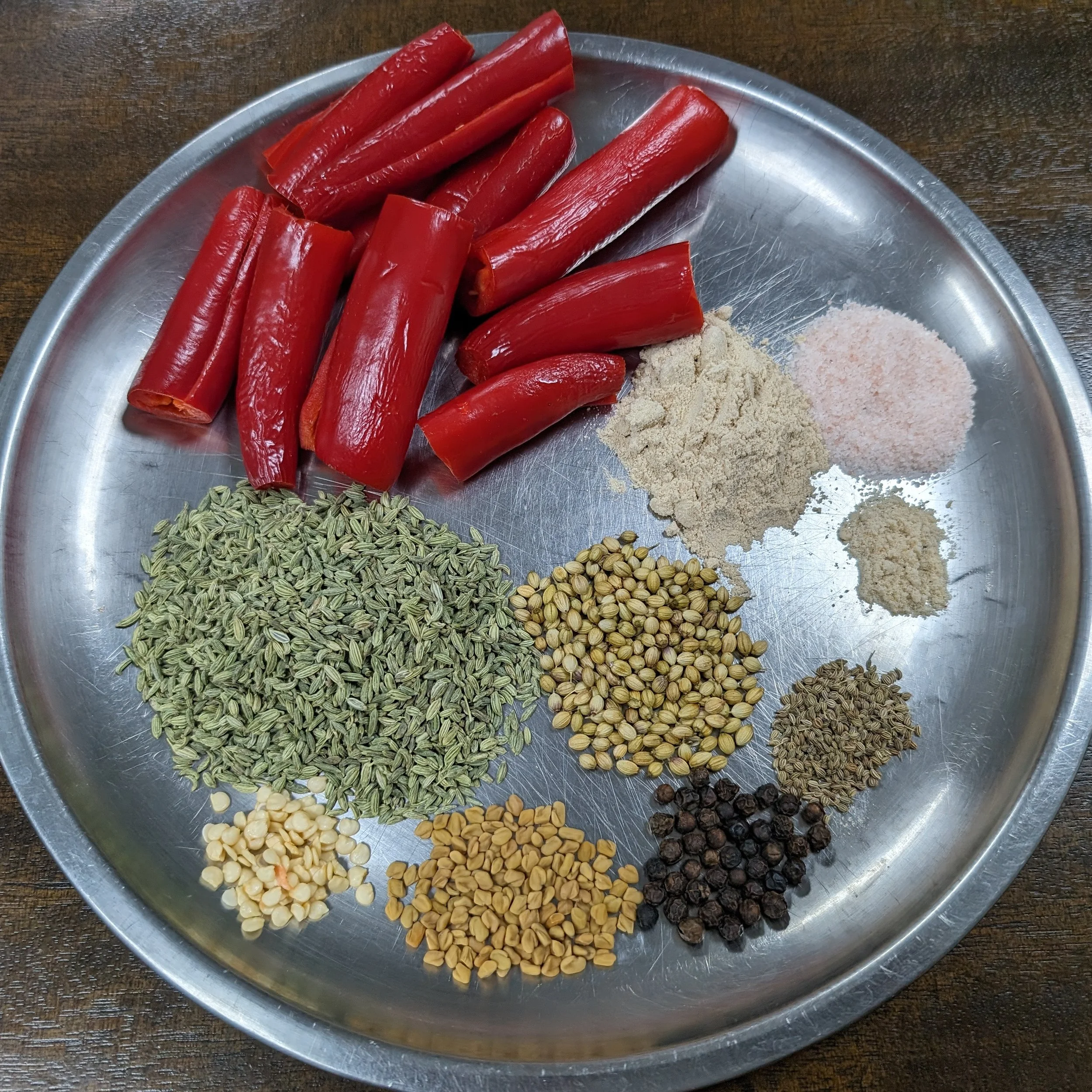 Dry roast the sauf, methi,ajwain, coriander and pepper seeds on low flame for 2-3 minutes. Allow it to cool then in a grinder jar grind them into a coarse powder.