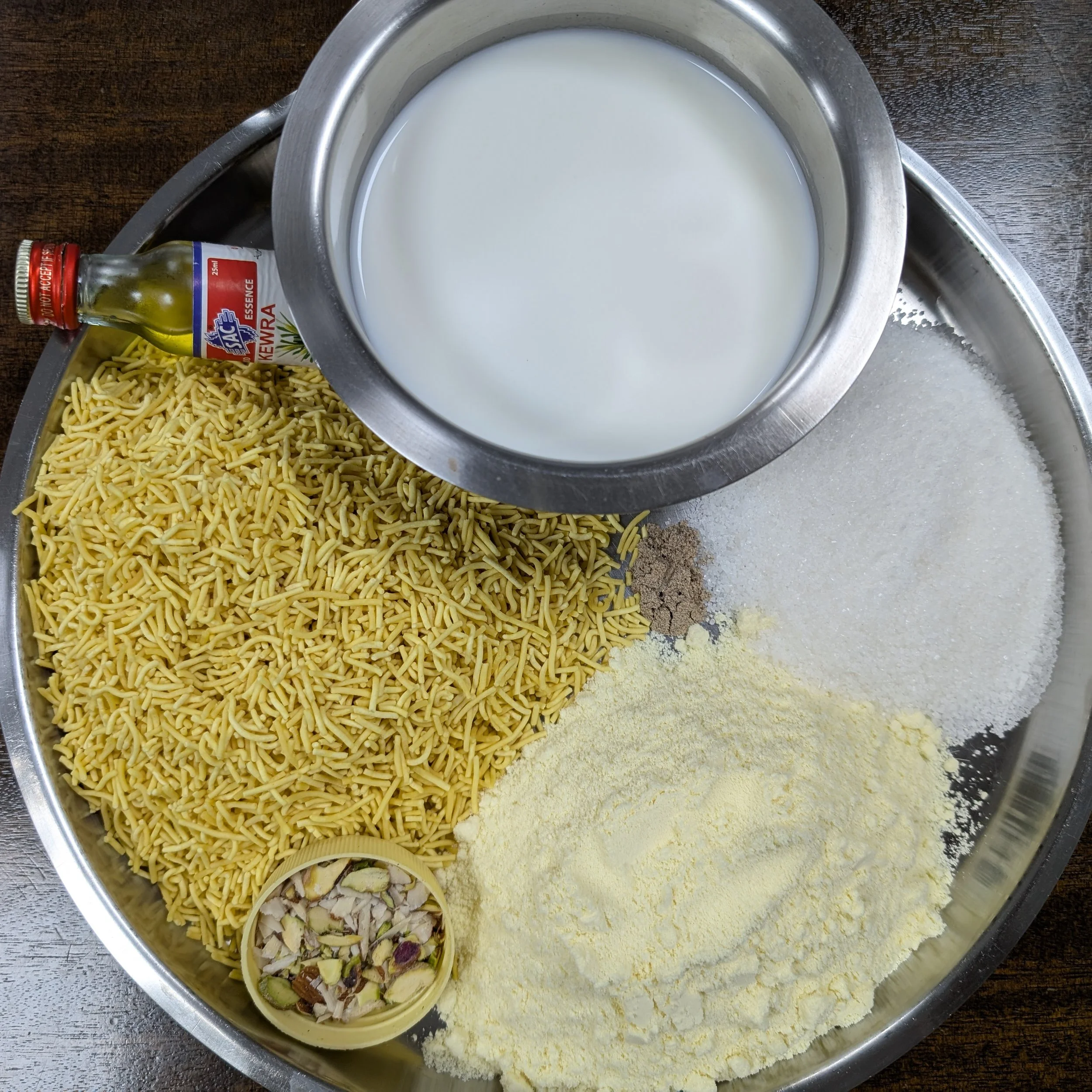 Add milk powder, cardamon powder, kewra essence and sev. Cook on low flame stirring continuously then add the ghee and cook again till the mixture leaves the sides and forms a soft dough.