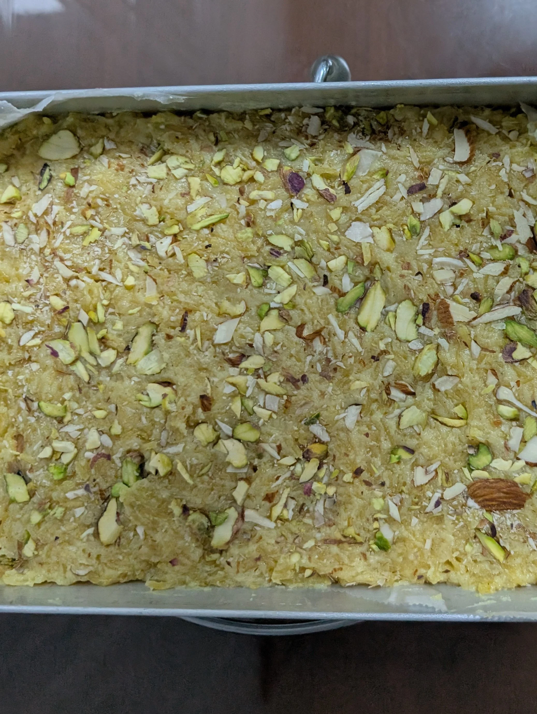 Remove and transfer the mixture onto a greased plate or baking tray. Level it with the back of the spoon.