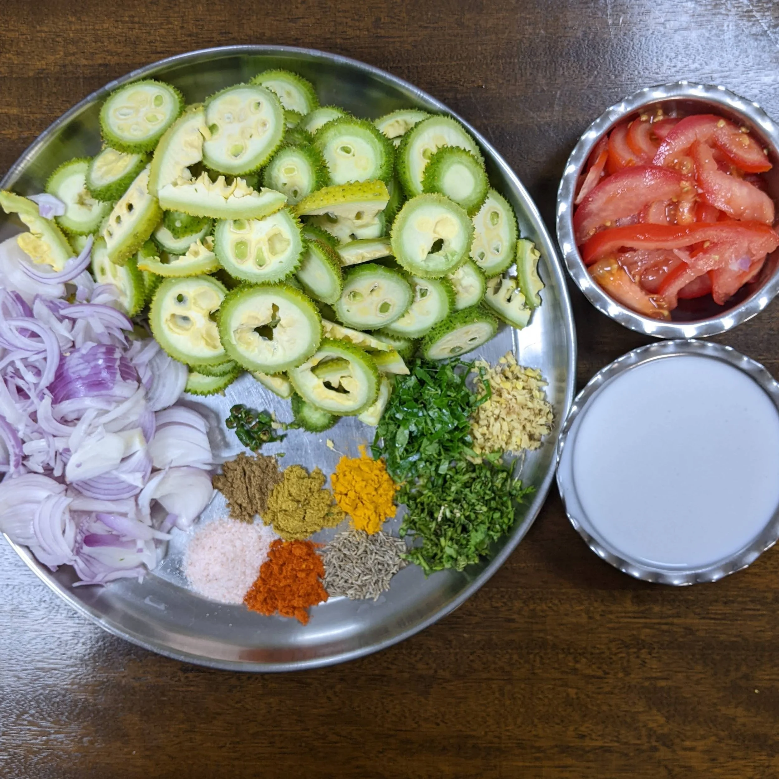 In a pan heat 2 tbsp oil then add the jeera when it splutters add the chopped curry leaves ginger. Add the onions and cook on low flame till soft and translucent.. Add the tomatoes and cook till soft and mushy. Then add all the dry spices , salt and sliced spiny gourd ,mix well.