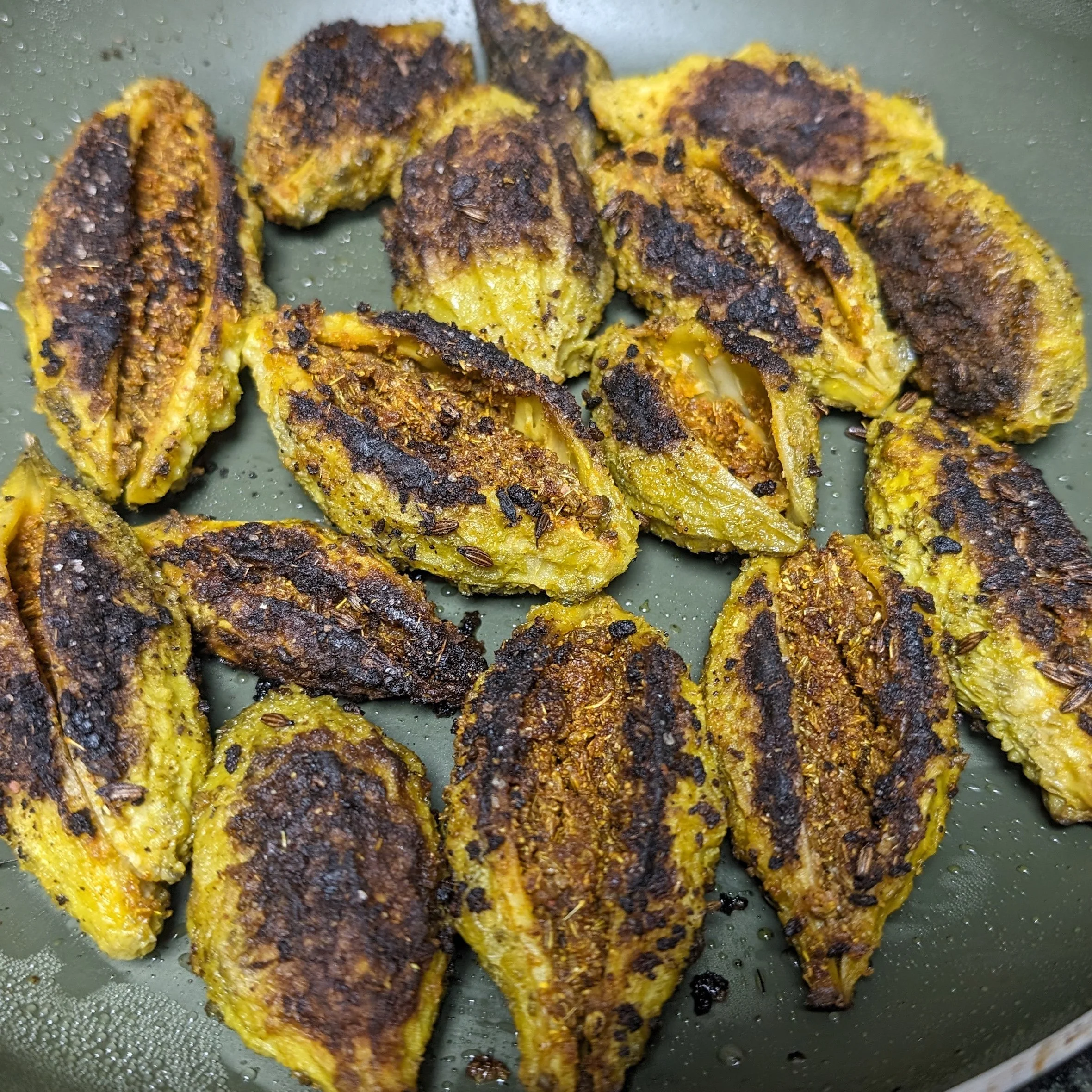 Take a wide mouth pan heat the remaining oil and place one by one all the karela. Cover and cook on low flame till slightly brown on one side then flip. Cover and cook on the other side also till golden brown in colour . If needed 1-2 tbsp oil can be sprinkled on the karela. When soft on both sides switch off the gas.