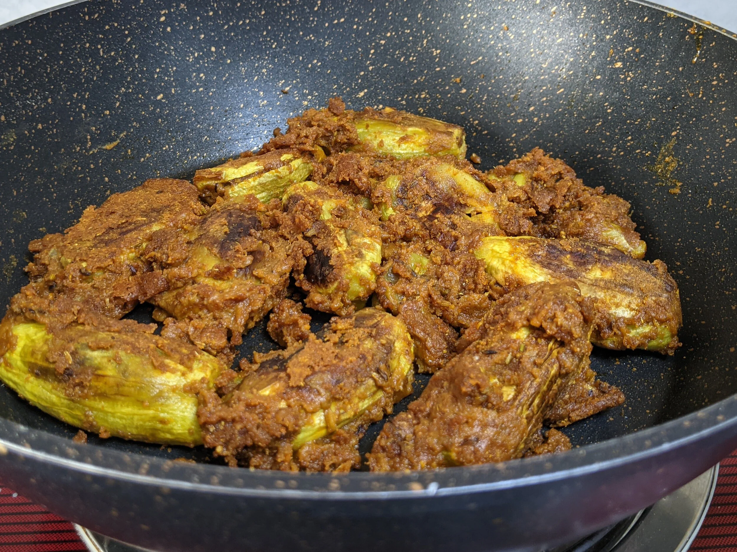 In the same pan heat 3-4 tbsp oil and place the parwal one by one in the pan. Cover and cook on low flame. When cooked on one side turn and again cover and cook till fully cooked from all sides. Add the remaining masala stuffing and cook for 2-3 minutes.