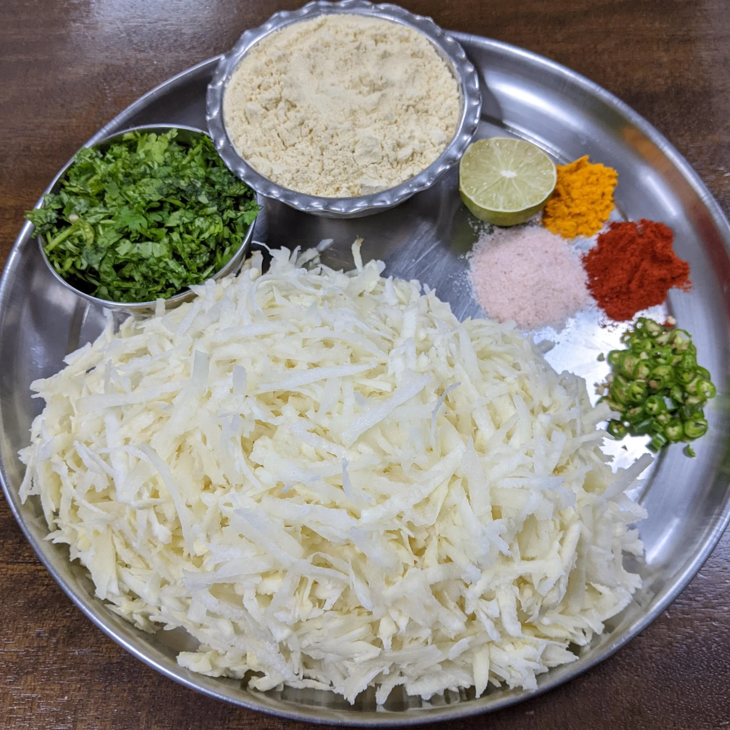 Using a thick grater, grate both the sweet potatoes and potatoes in water so that they do not turn black. Wash it nicely in the water and then squeeze them tightly to remove all the excess water.