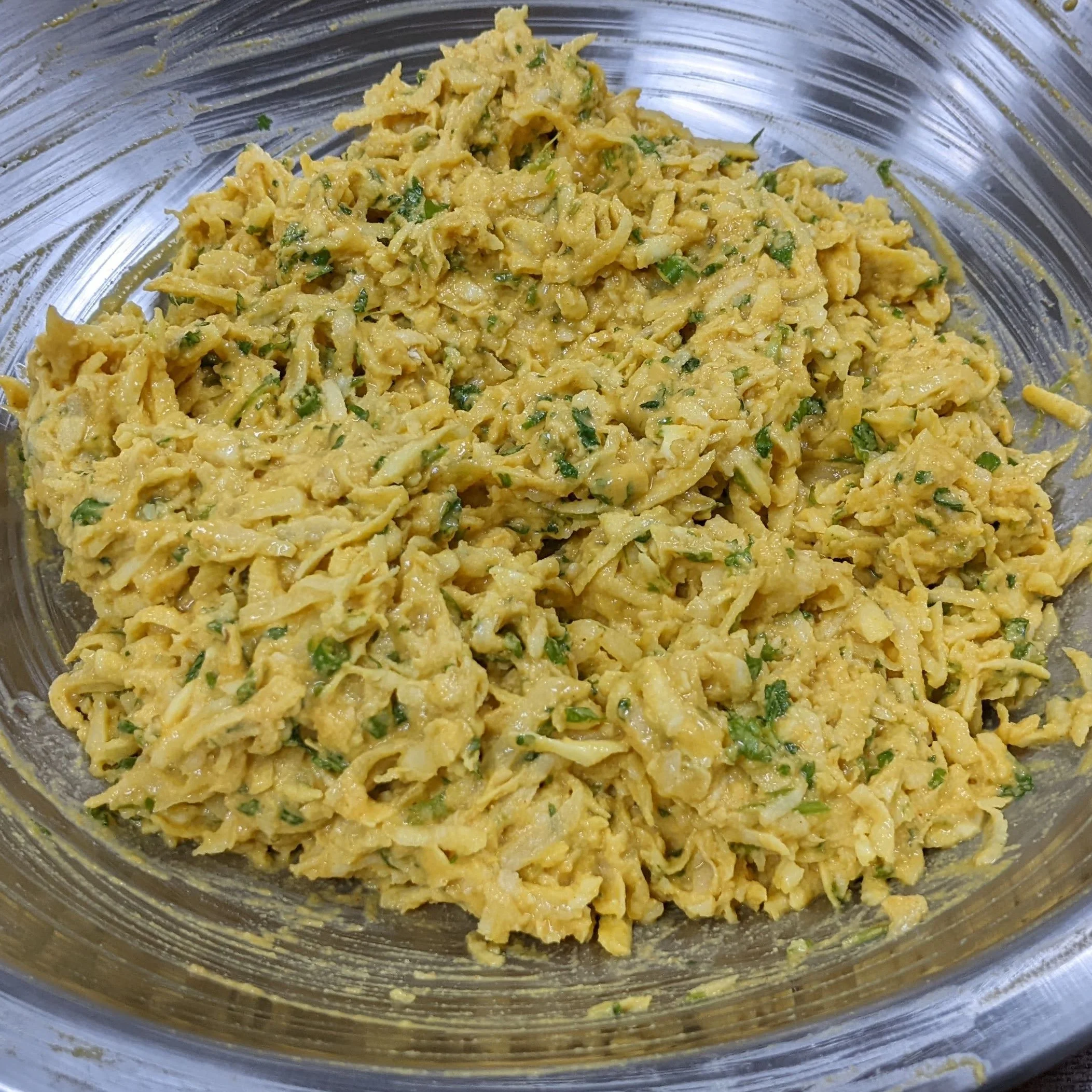 In a bowl add the squeezed sweet potatoes and potatoes and mix the turmeric , chilli powder, salt, chopped green chillies, coriander leaves and lemon juice in it. Add the gram flour and bind them all together . The mixture should not be too watery or too stiff.