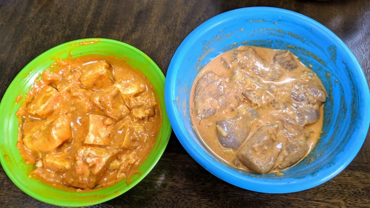 In a bowl mix the ginger/ garlic paste , green or red thai paste, salt , soya , lemon juice and coconut milk paste.