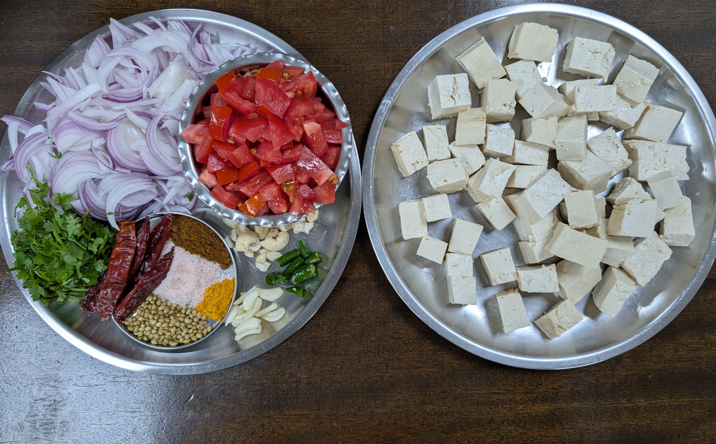 In a pan heat 2 tbsp oil then saute the onions till translucent, to it add the chopped tomatoes, green chillies, coriander leaves, garlic , cashews, salt , turmeric powder , garam masala, whole chillies and coriander seeds along with 1/2 cup water and cook on low flame till the water dries.
