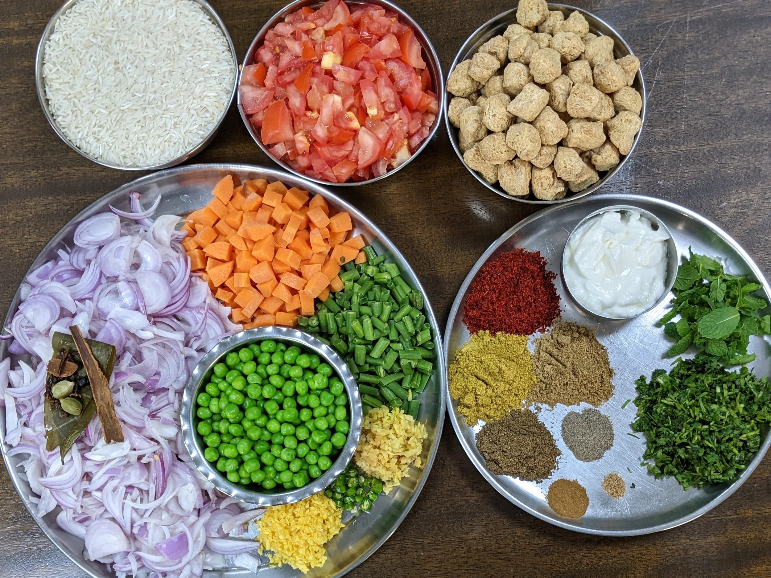 Serve this yummy Veg Soya Biryani with yogurt and papad.