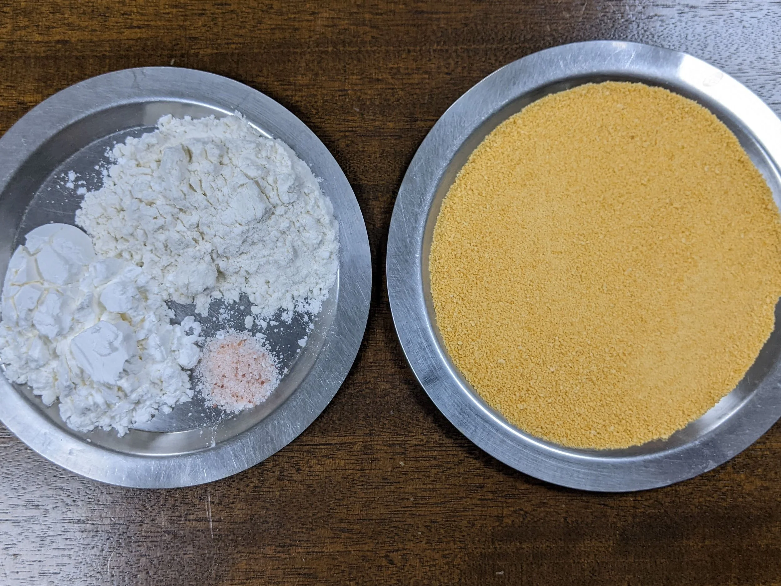 In a bowl make a slurry of medium dropping consistency with the cornflour, madia and salt.