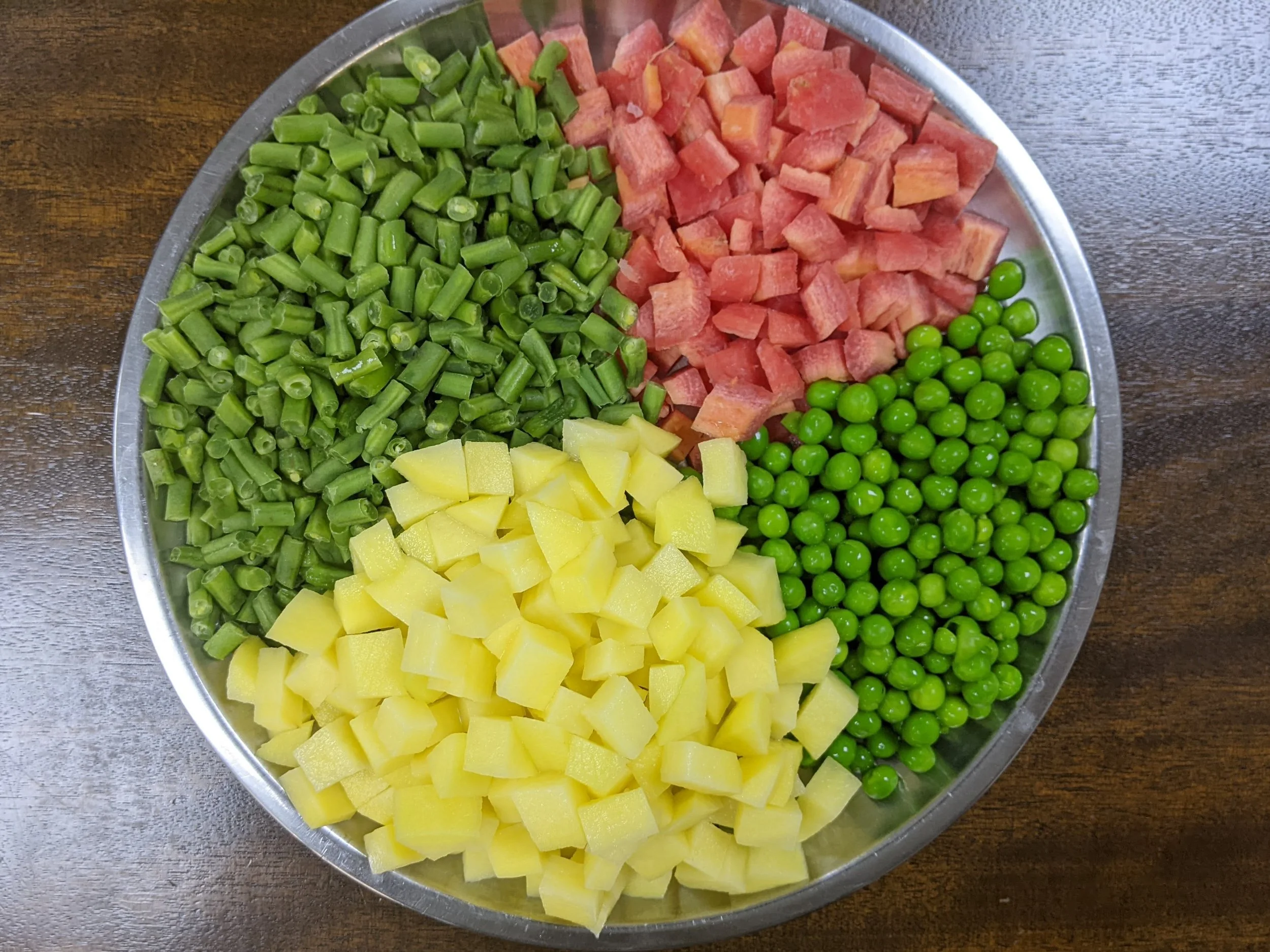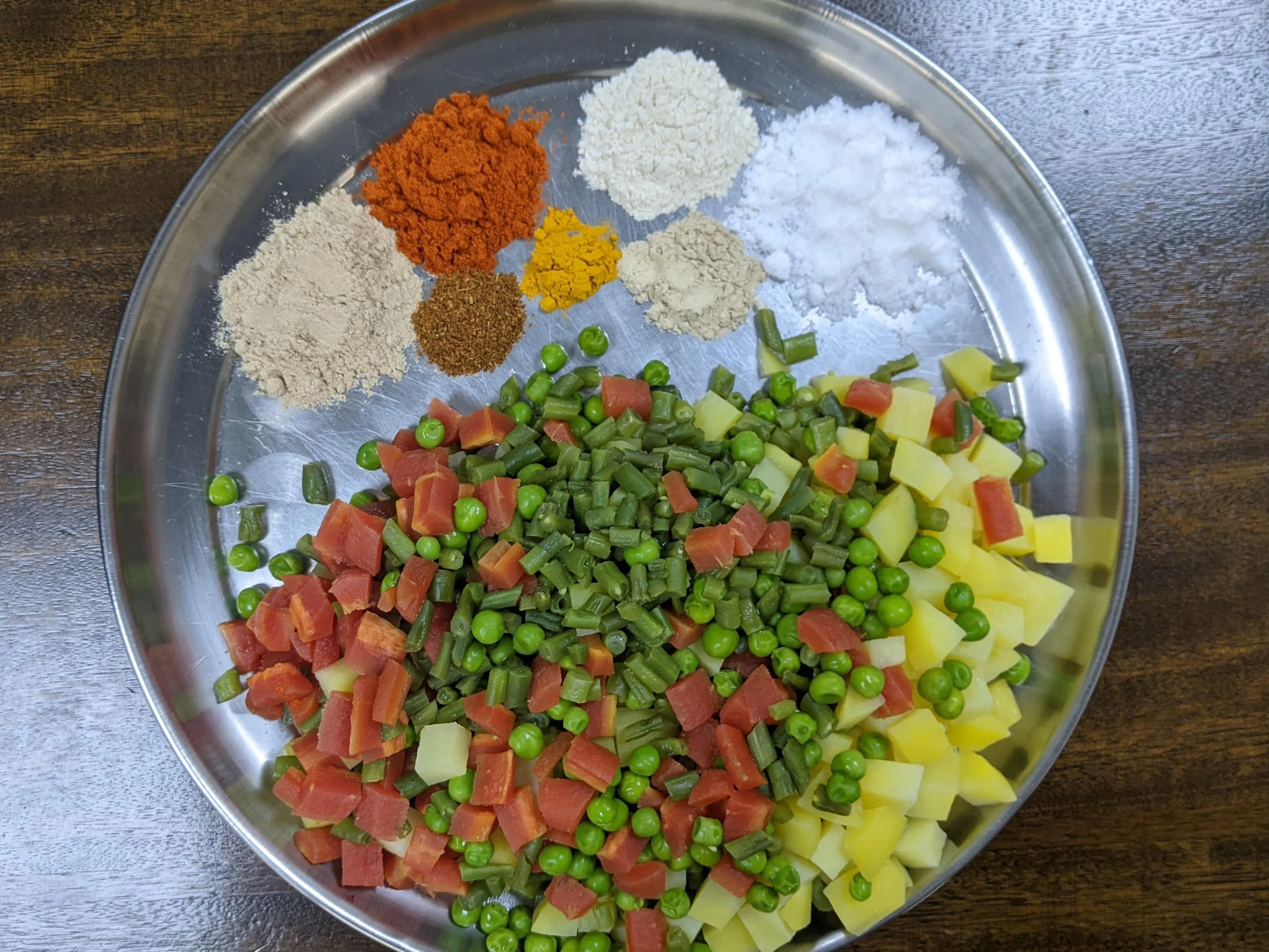 Clean, wash and chop all the vegetables into small cubes. In a steamer or vessel steam all the veggies for 5-10 minutes till they are soft. Remove the veggies and allow it to cool.