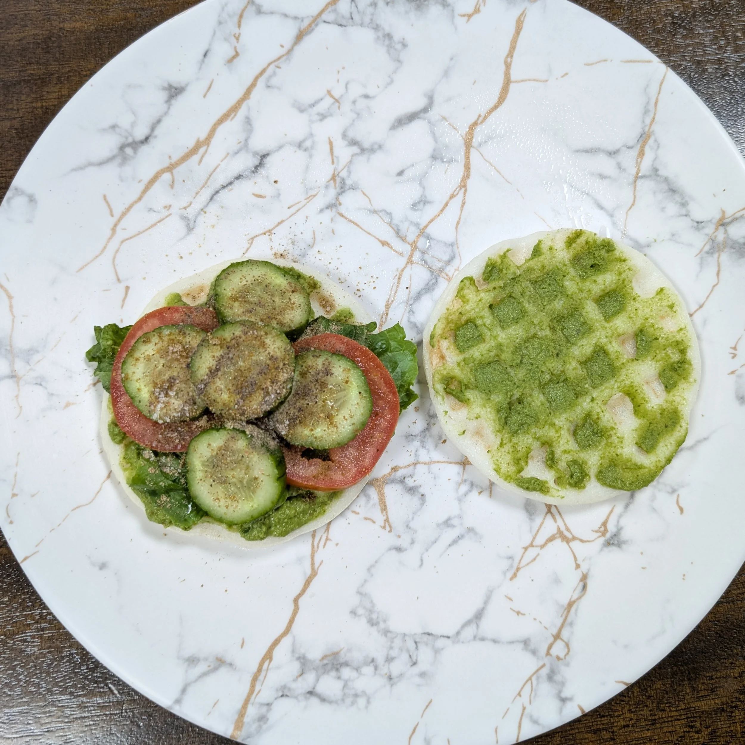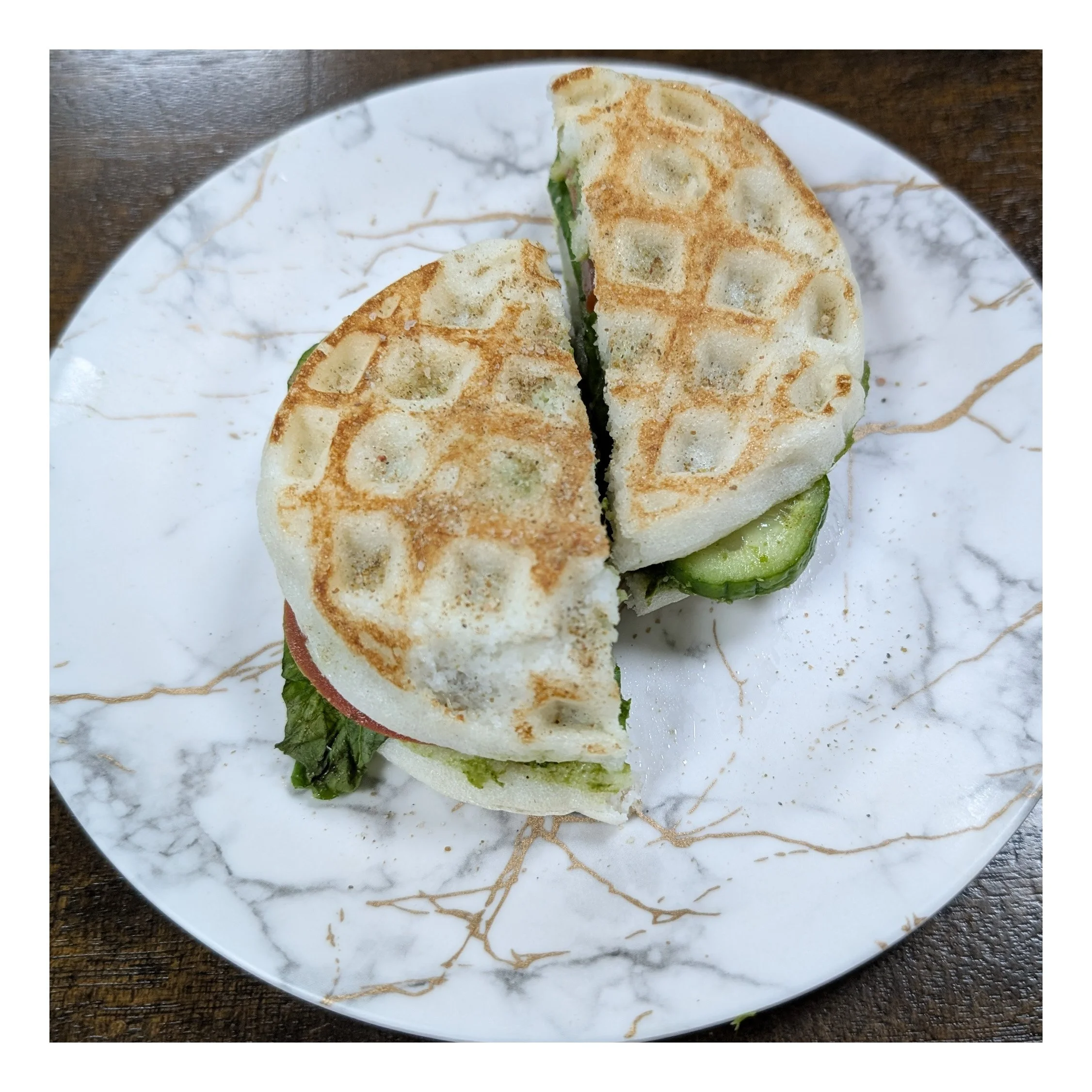 Take one waffle and spread some chutney all over it then place a lettuce leaf over it . Place some onion, cucumber and tomatoes slices on it . Sprinkle a little salt and chaat masala all over it. Take another waffle spread some chutney all over it then place this on the top .